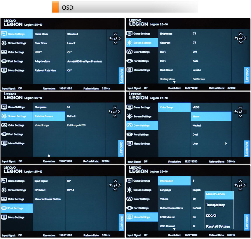 OSD 의 모습으로 게임셋팅이 별도로 제공되며 명암과 밝기 조정등이 가능한 것을 확인할 수 있다. 또한 컬러, 입력소스 등을 원하는 대로 설정할 수 있다.