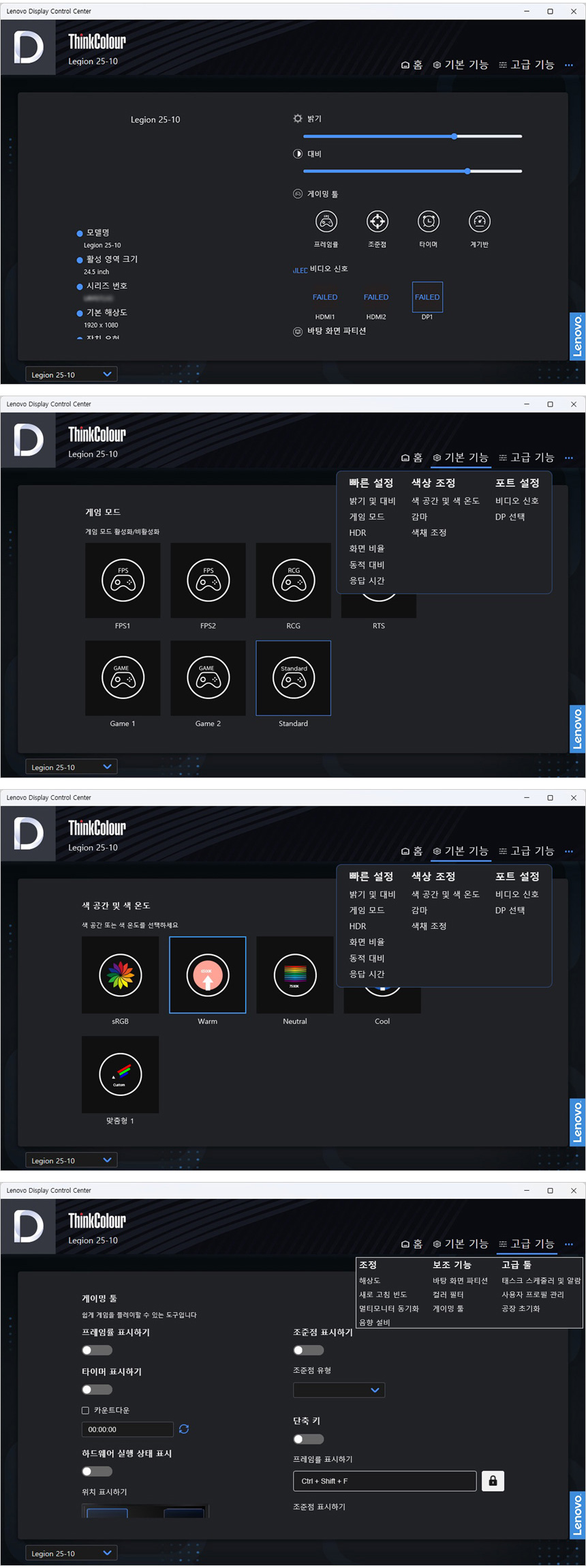 레노버 모니터는 전용 S/W를 제공해 PC를 이용해 모니터를 컨트롤 할 수 있다. 상단의 사진은 레노버 디스플레이 컨트롤 센터를 실행한 모습으로 기본적인 시스템 정보가 표시되며 밝기와 명암비, 입력소스, 색온도 등을 빠르게 조정할 수 있다. 기본기능과 고급기능으로 구분되며 OSD에서 지원하는 기능 뿐만 아니라 윈도우 디스플레이 설정도 제공해 편하게 모니터를 사용자에 맞게 셋팅할 수 있었다. (자세한 사항은 동영상을 참조하기 바란다.)