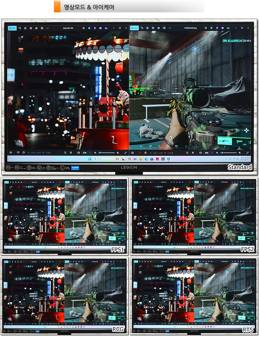 다양한 게임모드 지원으로 즐기는 게임에 최적화된 영상을 즐길 수 있다. 상단의 사진은 지원 모드를 비교한 모습으로 영상의 밝기가 달라지는 것을 확인할 수 있었다. 게임에 따라 일일이 밝기를 조절해야 하는 모니터들과 달리 전용 S/W 통해 게임 실행중에도 손쉽게 영상을 조정할 수 있다. (사진상으로는 큰 차이가 없어 보이지만 실제로 보면 차이가 느껴진다. 동영상을 참조하기 바란다.)
