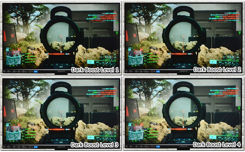 암부의 명암비를 높여 어두운 곳에 숨어있는 적을 쉽게 발견할 수 있도록 하는 다크 부스트를 지원한다. 상단의 사진은 비교 테스트를 진행하고 있는 모습으로 레벨값에 따라 차이가 확연한 것을 확인할 수 있었다.