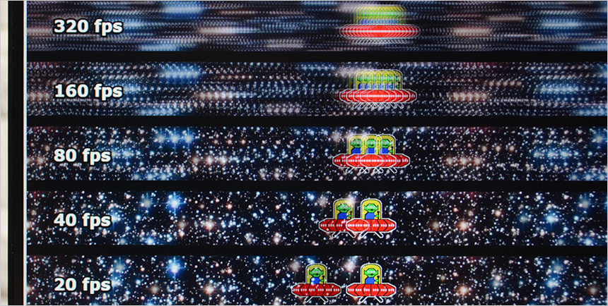 상단의 사진은 320Hz 의 높은 주사율을 쉽게 확인할 수 있도록 하위 프레임과 같이 재생되는 영상 (960 Pixel Per Sec) 을 셔터스피드 1/30 로 촬영한 모습으로 프레임이 낮을수록 캐릭터의 수가 적으며 프레임이 높아질수록 시간당 많은 화면이 뿌려지기 때문에 캐릭터의 수가 많은 것을 확인할 수 있다. 직접 눈으로 영상을 볼 경우 320Hz 의 경우 더 자연스럽게 UFO 가 이동한다.