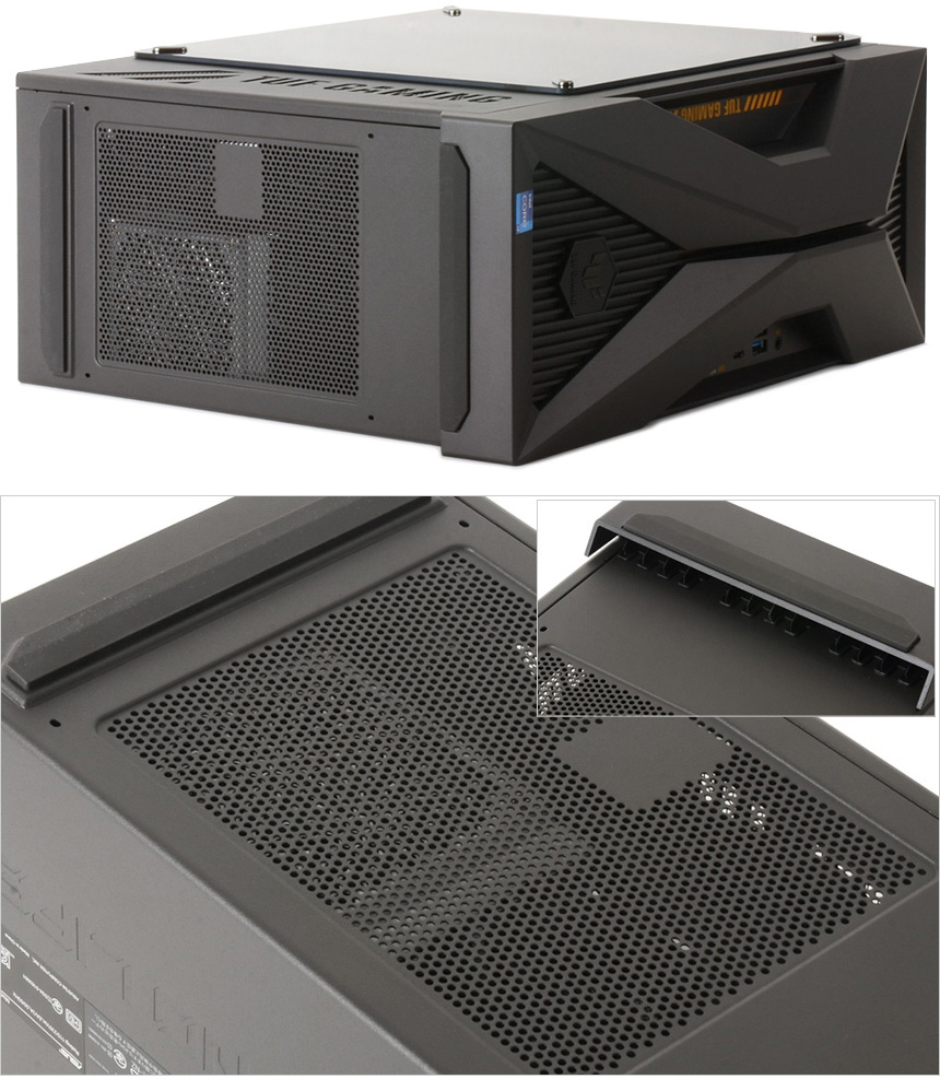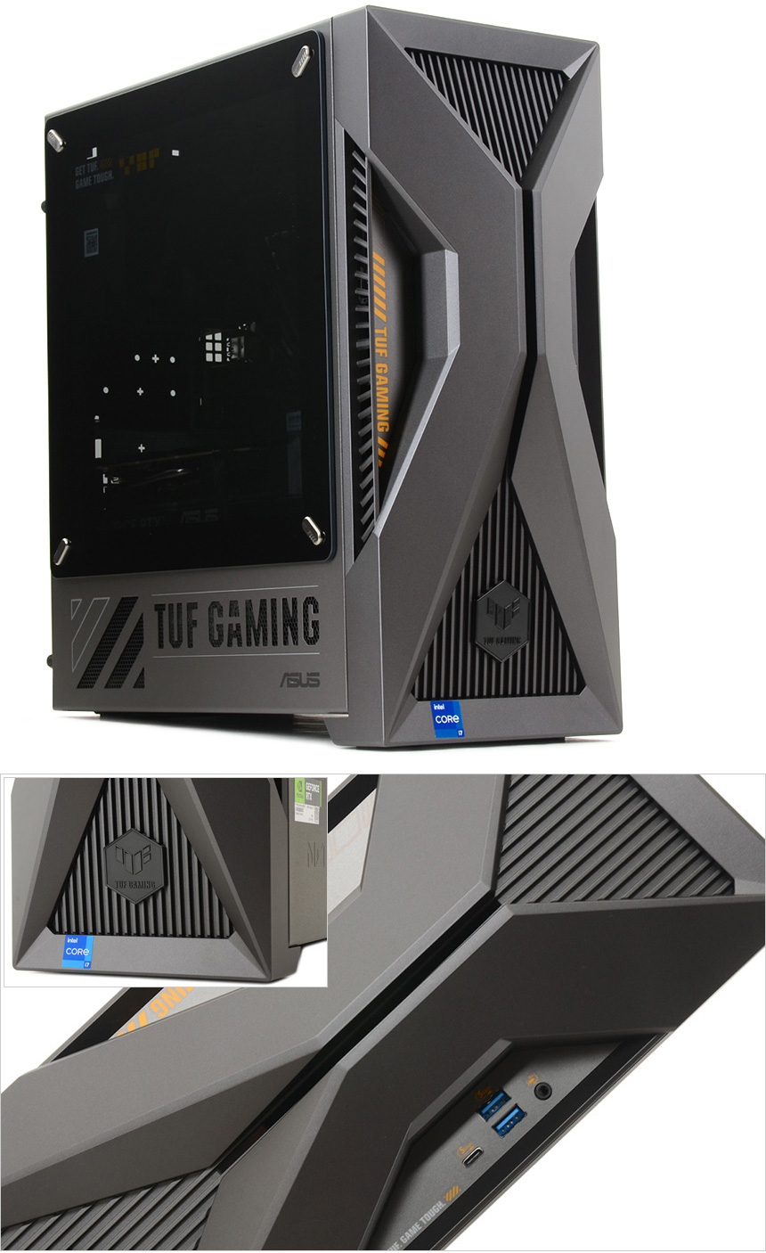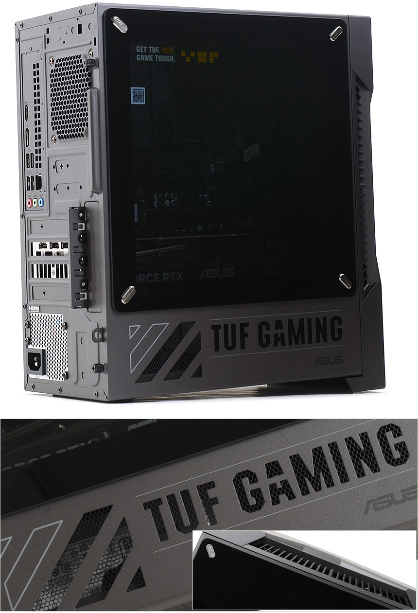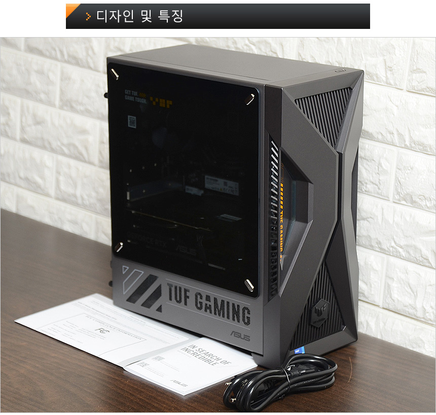 PC의 디자인은 게이밍 라인업인 TUF 시리즈의 최신작 답게 상당히 화려한 것을 확인할 수 있다. 로봇들이 주인공으로 나오는 메카 애니메이션에서 영감을 받은 디자인으로 최신 PC케이스들과 같이 투명한 측면 패널에 조명을 적용해 디자인 만족감을 한층 높였으며 높은 마감완성도로 고급스러운 느낌을 자아낸다. (참고로 이 제품은 밀리터리 등급의 견고함을 자랑하는 모델로 MIL-STD-810H 기준을 충족한다. 극한의 환경에서도 안심하고 PC를 사용할 수 있다.)
