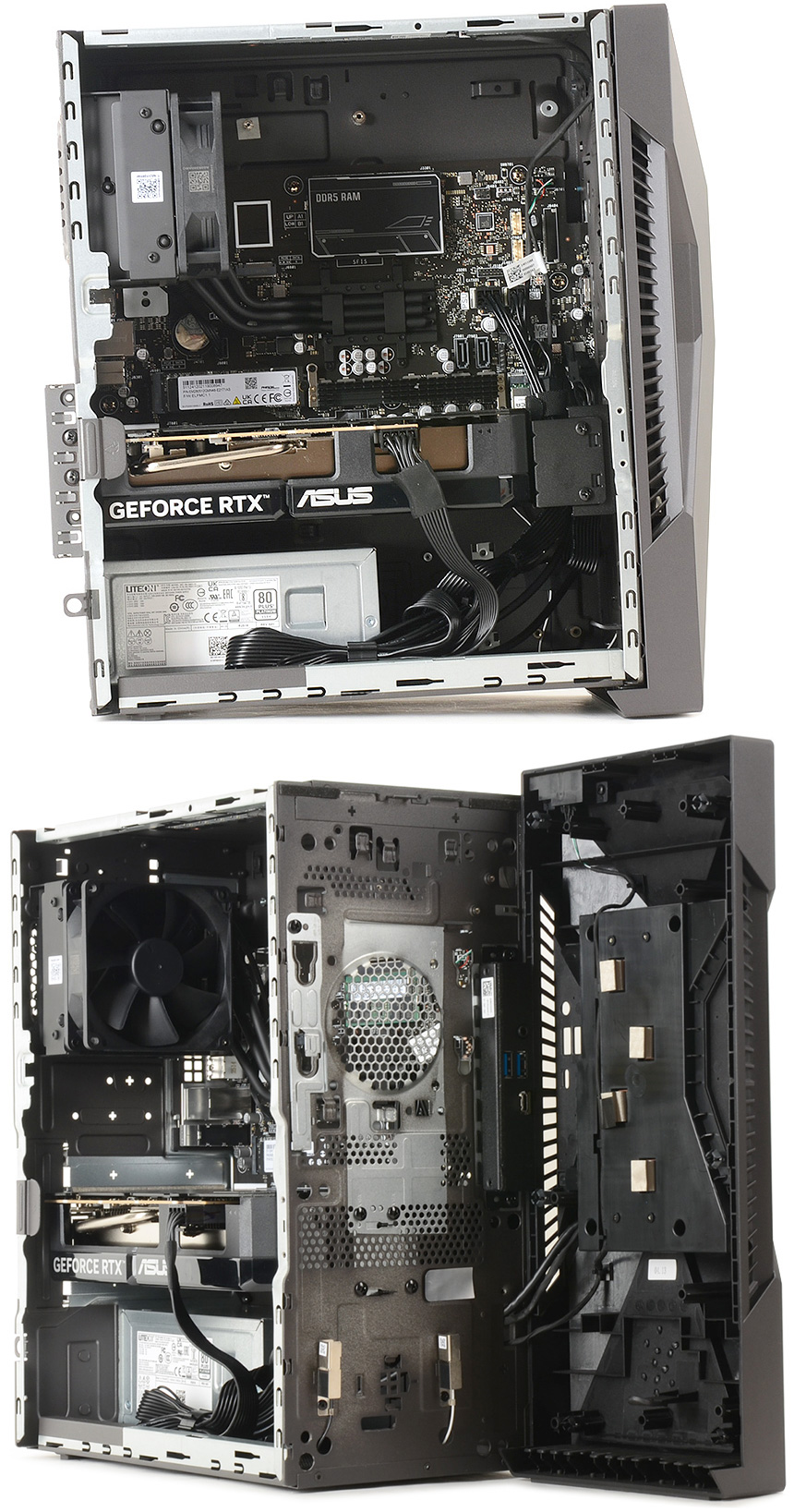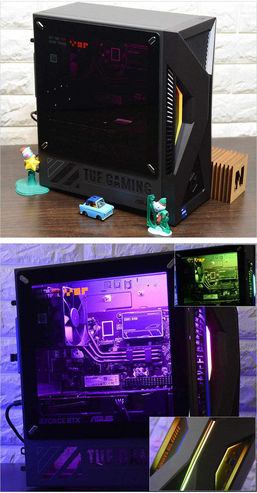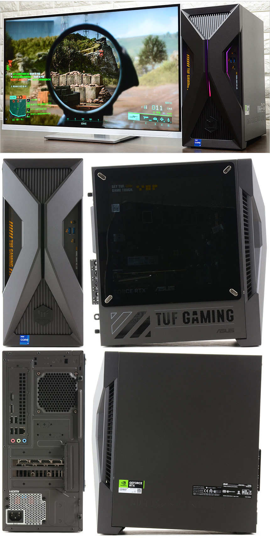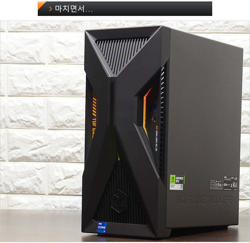 PC의 디자인은 게이밍 라인업인 TUF 시리즈의 최신작 답게 상당히 화려한 것을 확인할 수 있다. 로봇들이 주인공으로 나오는 메카 애니메이션에서 영감을 받은 디자인으로 최신 PC케이스들과 같이 투명한 측면 패널에 조명을 적용해 디자인 만족감을 한층 높였으며 높은 마감완성도로 고급스러운 느낌을 자아낸다. (참고로 이 제품은 밀리터리 등급의 견고함을 자랑하는 모델로 MIL-STD-810H 기준을 충족한다. 극한의 환경에서도 안심하고 PC를 사용할 수 있다.)