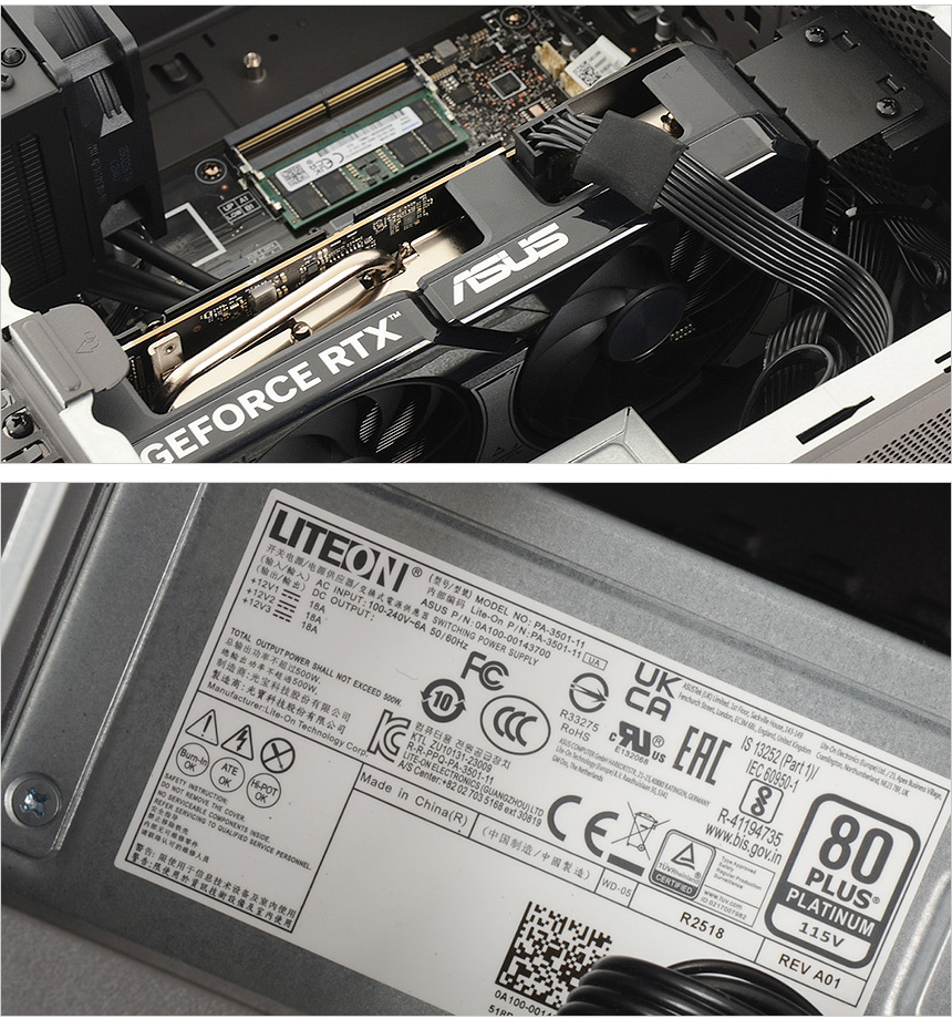 중앙에는 RTX 5060 Ti 그래픽카드가 설치되어 있고 중력으로 인해 그래픽카드가 쳐지는 것을 방지하기 위해 PC케이스와 연결된 것이 눈에 띈다. 또한 하단에는 80+ 플래티넘 인증으로 효율성을 높인 500W 파워 서플라이가 장착된 것을 확인할 수 있다.