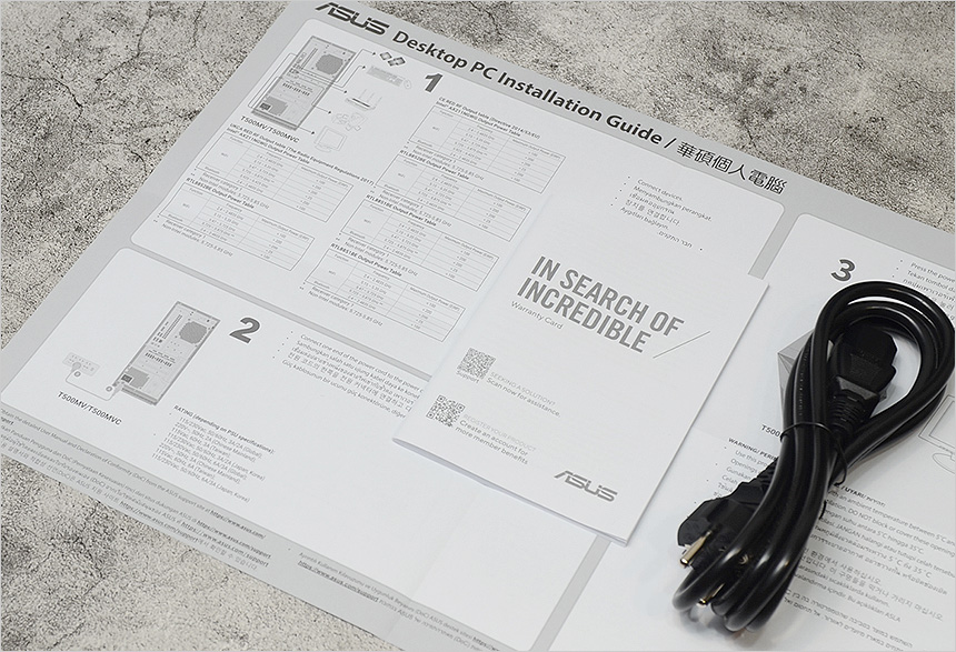 기본 제공되는 액세서리의 모습으로 퀵 매뉴얼과 보증서, 전원 케이블이 제공되는 것을 확인할 수 있다.