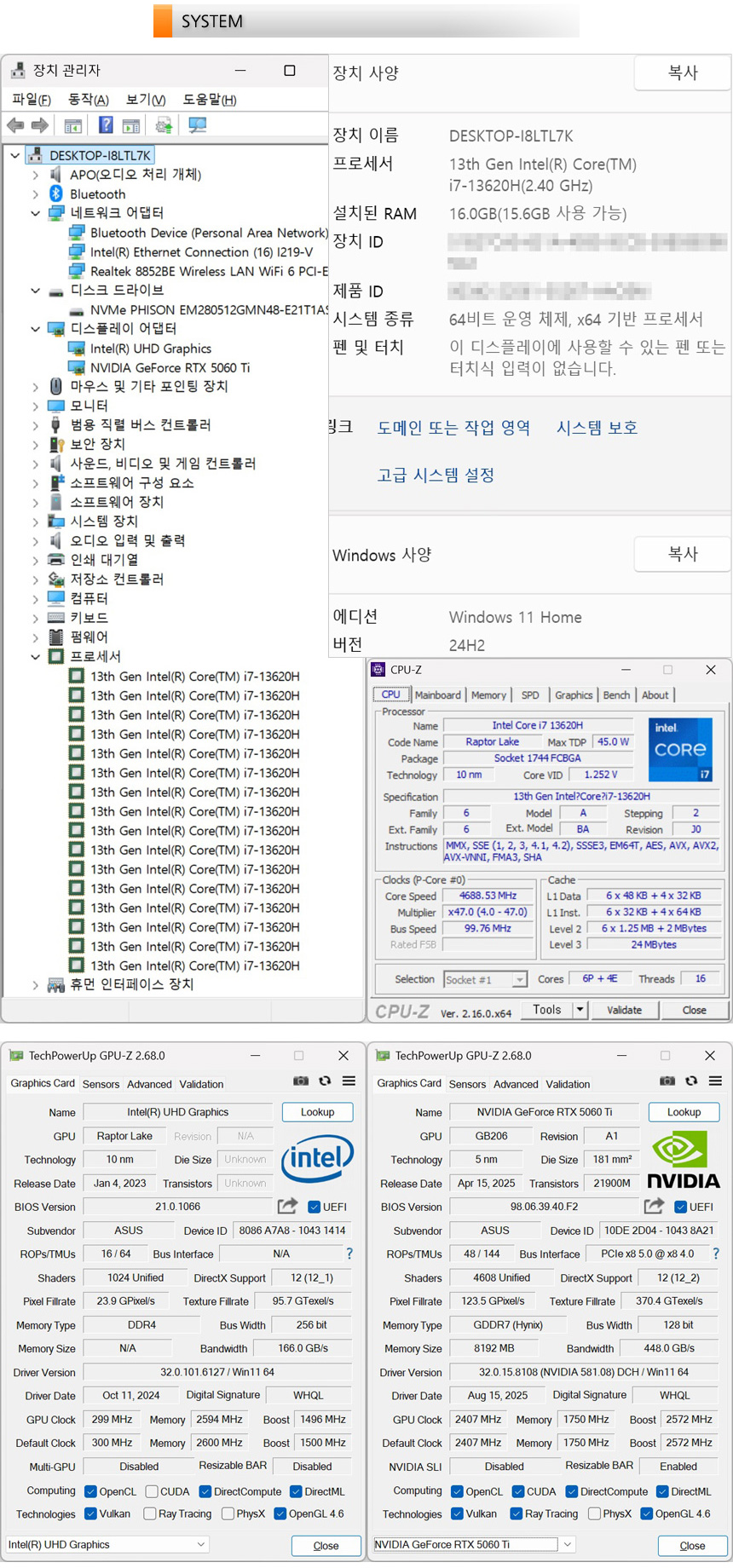 시스템 정보를 확인하고 있는 모습으로 6+4코어에 24MB 캐시가 장착된 13세대 인텔코어 프로세서 i7-13620H가 장착된 것을 확인할 수 있으며 RTX 5060 Ti 그래픽카드를 지원해 최신 게임을 상위 옵션에서 부드럽게 즐길 수 있다. 또한 16GB 메모리와 512GB NVMe SSD가 설치되어 게임은 물론 고성능을 필요로 하는 전문가용 S/W 도 부드럽게 실행할 수 있다.