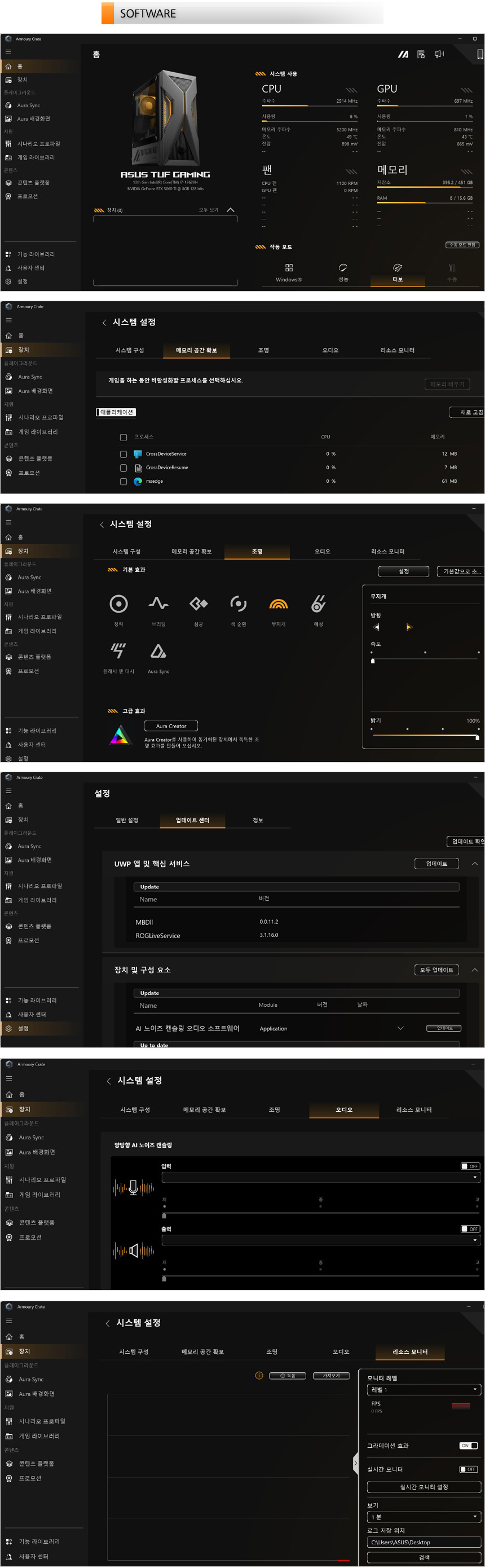 ASUS Armory Crate를 지원해 PC를 사용자에 맞게 셋팅할 수 있다. 메인화면에서 퍼포먼스 셋팅이 가능하며 게임관련 다양한 설정이 제공되는 것을 확인할 수 있다. 디자인 부분에서 언급한 것과 같이 조명을 원하는 대로 설정할 수 있으며 업데이트 센터를 지원해 최상의 컨디션으로 PC를 사용할 수 있다.
