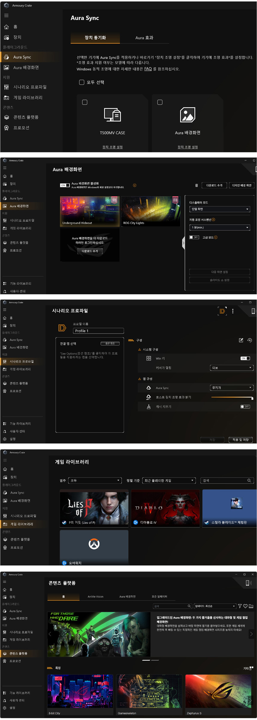 주변기기 와의 조명 동기화를 위해 아우라 싱크를 지원하며 배경화면을 지원한다. 또한 라이브러리를 제공해 설치된 게임을 손쉽게 선택해 즐길 수 있다.