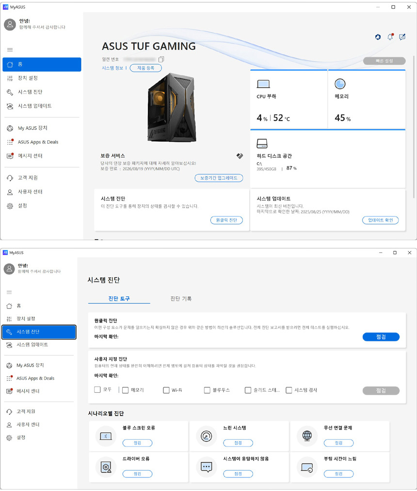 시스템 업데이트와 시스템 모니터링, 진단등을 지원하는 MyASUS 앱이 설치되어 있다.