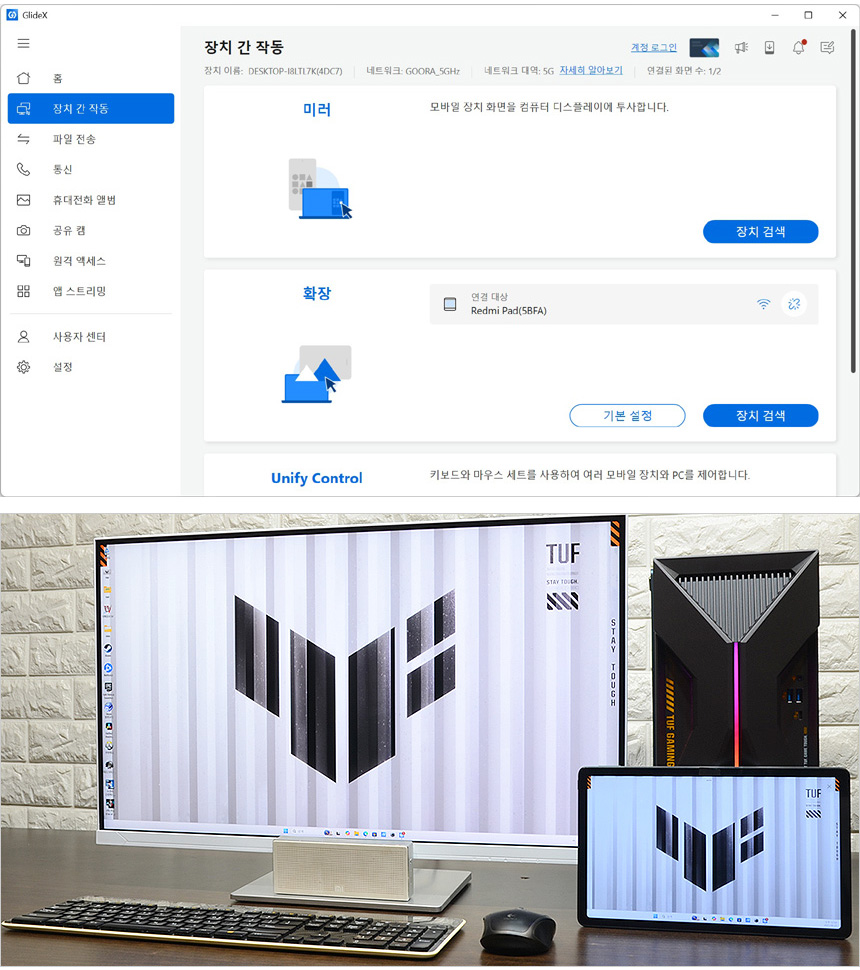 GlideX 앱을 지원해 화면의 복제나 확장, 유니파이 컨트롤이 가능하다. 상단의 사진은 확장 기능을 실행한 모습으로 태블릿PC를 확장 모니터로 사용할 수 있었다. (참고로 미러를 선택하면 스마트폰 화면이 노트북에 표시된다.)