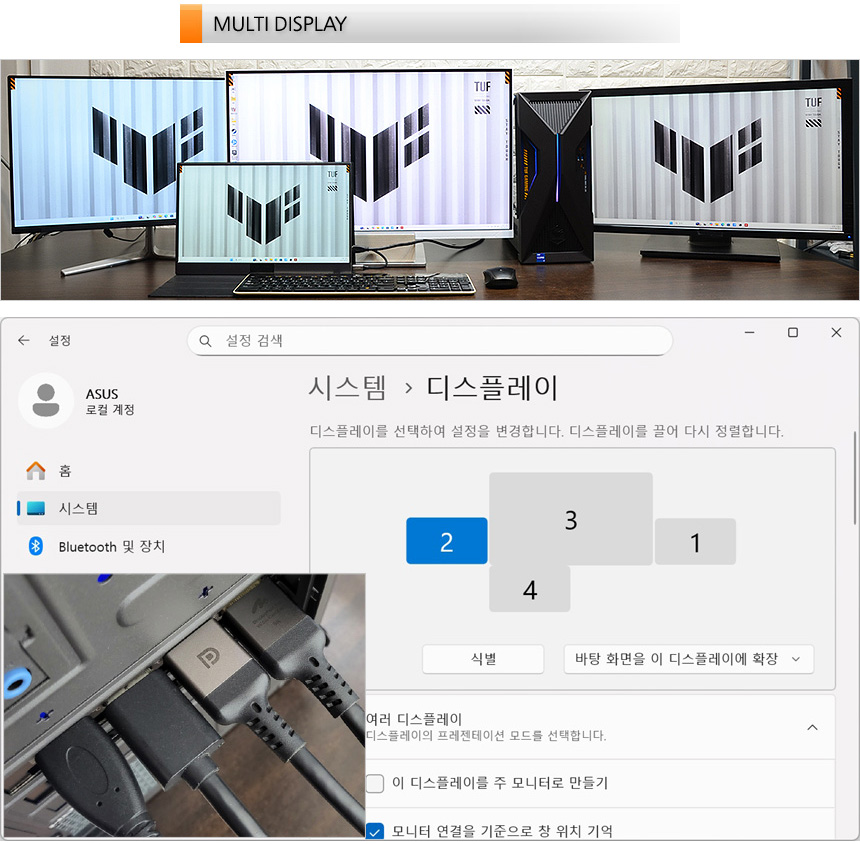 RTX 5060 Ti 그래픽카드는 최대 4개의 디스플레이 연결을 지원한다. 상단의 사진은 4K와 3개의 FHD 모니터를 연결한 모습으로 정상적으로 작동하는 것을 확인할 수 있었다. 다중모니터 활용이 필수적인 전문직 종사자 등이 유용하게 활용할 수 있을 것이다.