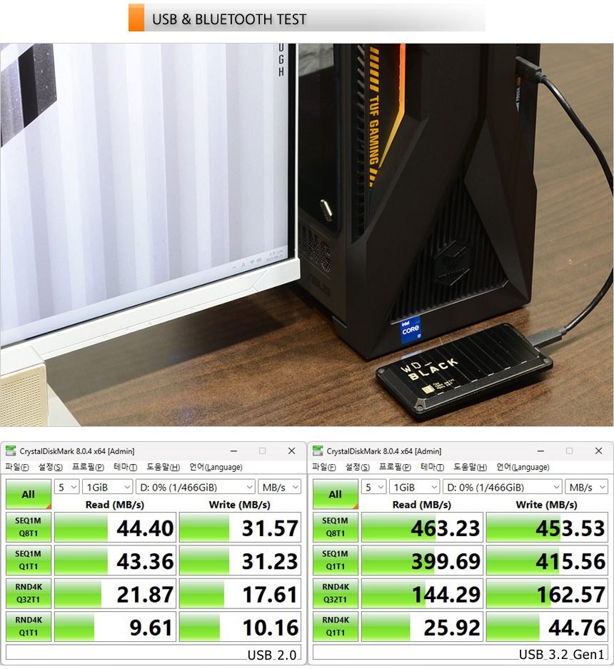 A타입과 C타입의 USB 3.2 Gen1를 지원해 빠른 데이터 전송이 가능하다. 상단의 사진은 외장 SSD를 이용해 속도 테스트를 진행하는 모습으로 USB 2.0 과 확연한 차이를 보여주는 것을 확인할 수 있다.