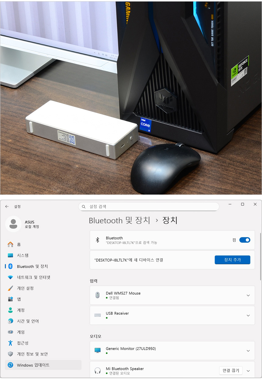 무선랜카드 설치된 제품으로 블루투스를 지원해 무선 환경을 구축하는데 용이하다. 테스트용 마우스와 스피커를 이용해 블루투스 테스트를 진행했는데 문제없이 인식되는 것을 확인할 수 있었다.
