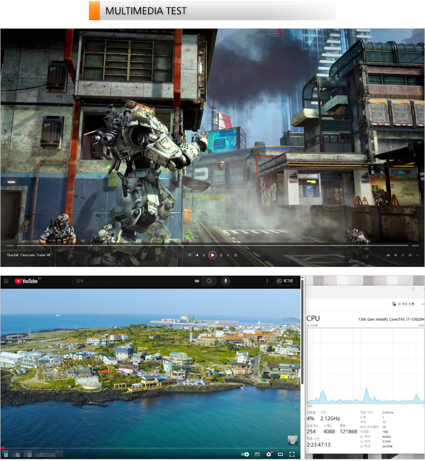 4K 동영상을 이용해 멀티미디어 테스트를 진행하고 있는 모습으로 부드럽게 구동되는 것을 확인할 수 있었다. 4K 모니터 등을 연결해 고화질 영상을 즐기는 용도로도 충분히 활용할 수 있다. 또한 유튜브 고화질 동영상을 이용해 CPU 점유율을 테스트 해 보았는데 (2160P@60FPS) 3-12% 대의 점유율을 보여 주었으며 인터넷을 실행했을 때 40% 초반까지 점유율이 올라가는 것을 확인할 수 있었다.