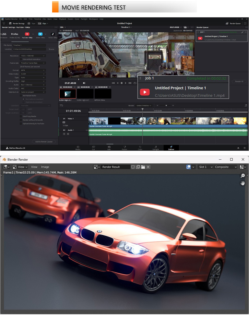 영상편집 S/W 다빈치 리졸브를 이용해 랜더링 테스트를 진행하고 있는 모습으로 (640MB, 920MB, 990MB 4K 동영상을 단일 동영상으로 랜더링, FHD 해상도에 H.264 비디오 코덱) 2분 32초가 소요되는 것을 확인할 수 있었다. 또한 블랜더 랜더링 테스트에서도 4~5분대의 시간을 보여주는 일반 PC와 달리 2분대의 빠른 랜더링 시간을 보여주었다. (인텔코어 울트라 225F 보다 빠른 것을 확인할 수 있었다. 게이밍에 특화된 모델이지만 영상편집 등의 작업용으로도 유용하게 사용할 수 있다.)