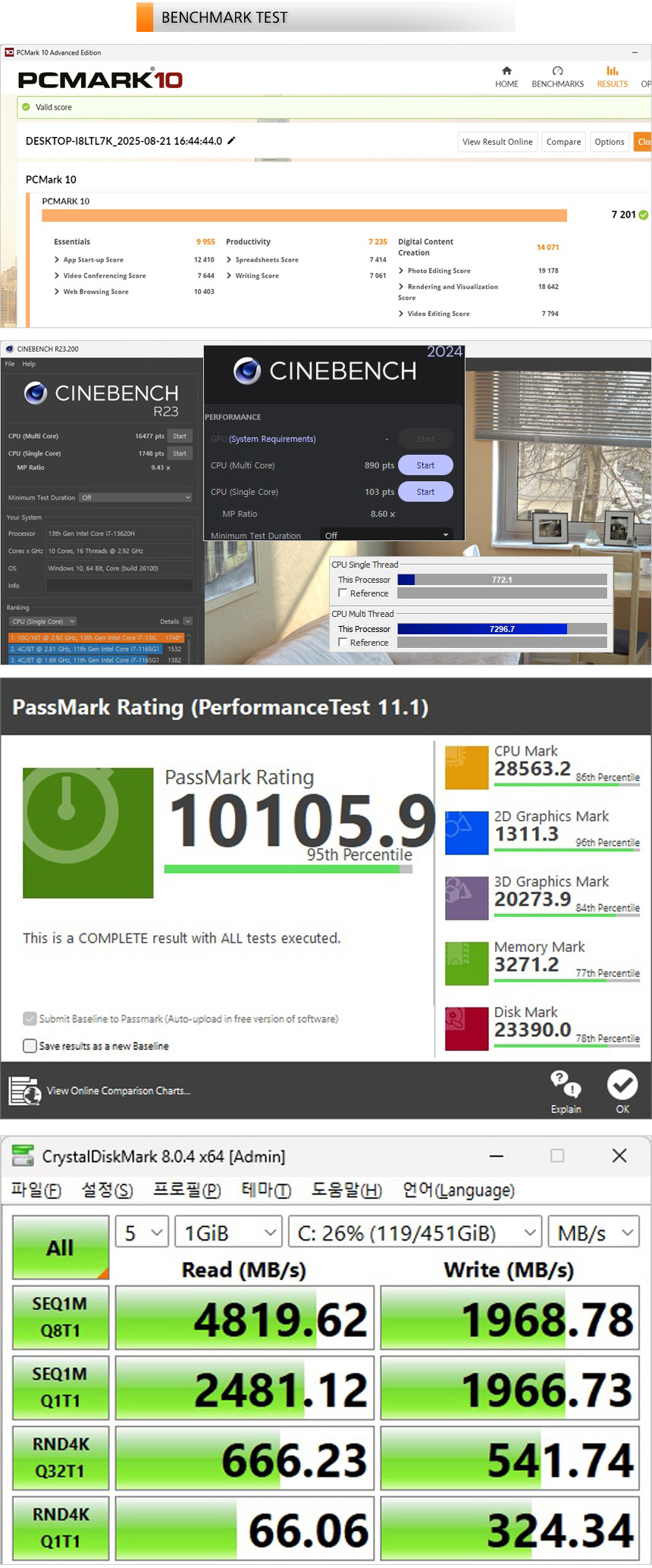 하지만 걱정과 달리 벤치마크 스코어는 물론 실제 게임 테스트에서도 RTX 5060을 탑재한 비슷한 스펙의 모델과 비교해 높은 3D 퍼포먼스를 보여주는 것을 확인할 수 있었다. (CPU가 그래픽성능의 발목을 잡는다는 느낌은 들지 않았다.) QHD 해상도 게이밍 모니터 정도는 충분히 소화할 수 있는 모델로 게임은 물론 AI 나 작업용으로도 유용하게 사용할 수 있을 것이다. @ 참고로 i7-13620H 프로세서는 인텔코어 울트라 225 대비 살짝 낮은 성능을 보여주어 게이밍 용도로 충분히 사용할 수 있다.