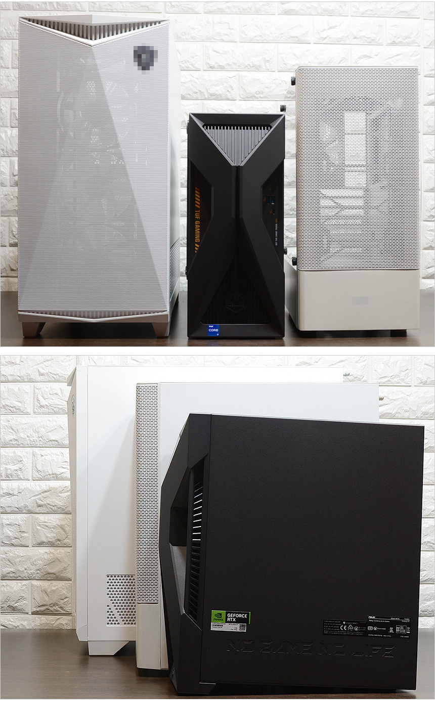 게이머나 작업자 들이 흔히 사용하는 빅타워 & 미들타워 PC케이스와 크기를 비교한 모습으로 차이가 확연한 것을 확인할 수 있다. 책상위에 PC를 올려두거나 책상등이 협소할 경우 PC의 크기가 작을수록 매리트가 커지는 것을 고려해 설계된 모델로 사무용 PC수준으로 크기를 줄여 쉽게 책상에 설치해 사용할 수 있다.