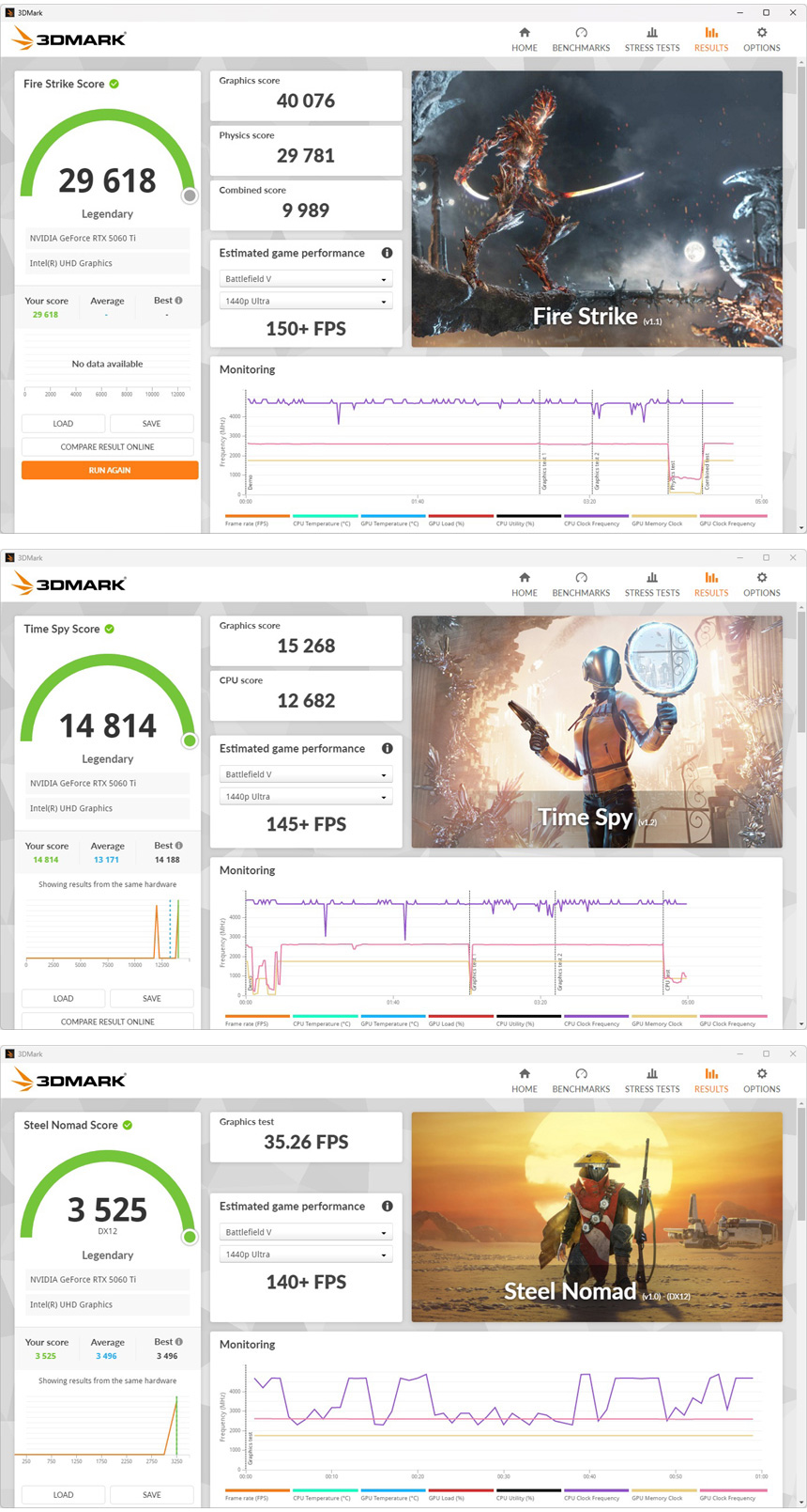 3DMARK를 이용해 3D 퍼포먼스를 확인하고 있는 모습으로 최신 게임도 상위 옵션에서 부드럽게 플레이 할 수 있는 스코어를 보여주었다. (8GB 비디오 전용램을 지원하지만 RTX 5060 과 분명한 스코어 차를 보여주었다.)