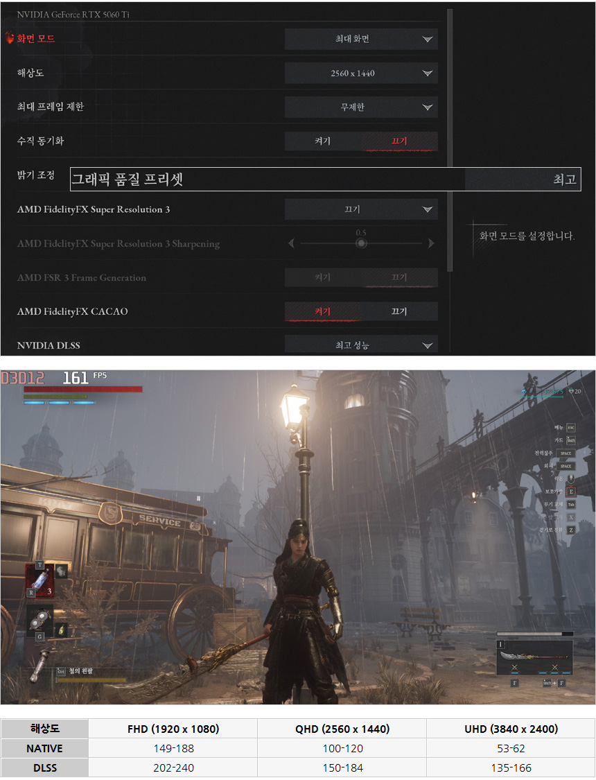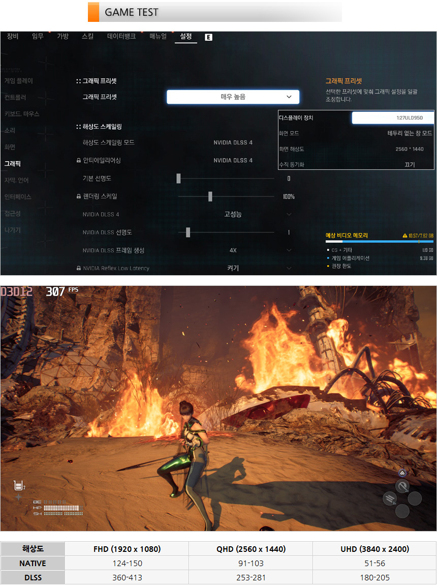 스텔라 블레이드를 매우 높음 옵션으로 플레이 하고 있는 모습으로 DLSS를 사용하면 해상도에 상관없이 부드럽게 게임을 즐길 수 있다. DLSS를 사용하지 않을 경우 QHD 까지는 원활한 게임 플레이가 가능하다.