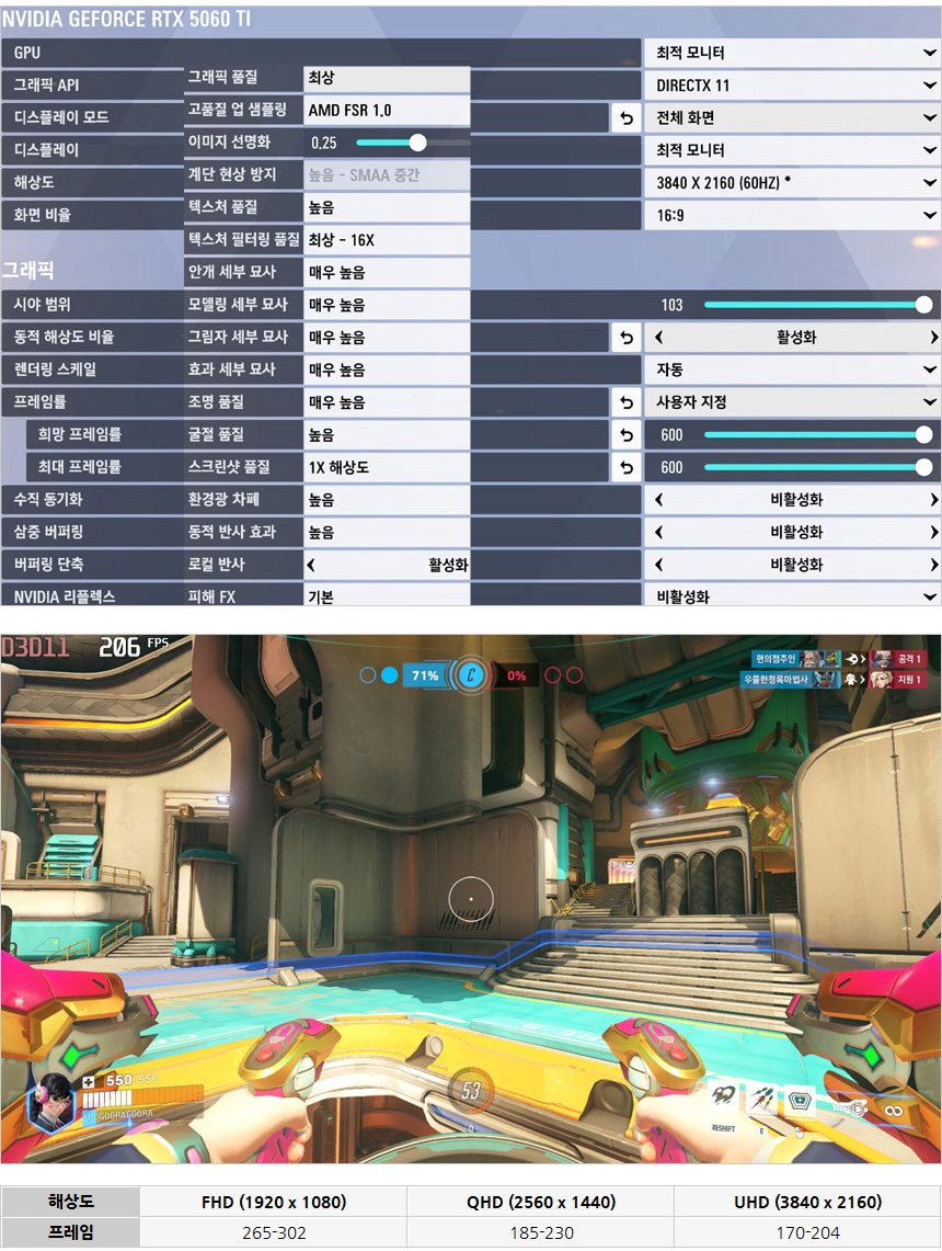 오버워치2를 최상 옵션에서 플레이 하고 있는 모습으로 4K 해상도에서도 100 프레임을 훌쩍 넘는 높은 성능을 보여주었다. FHD와 QHD 해상도의 경우 옵션을 조정해 주면 240Hz 와 180Hz 게이밍 모니터 사용이 가능하다.