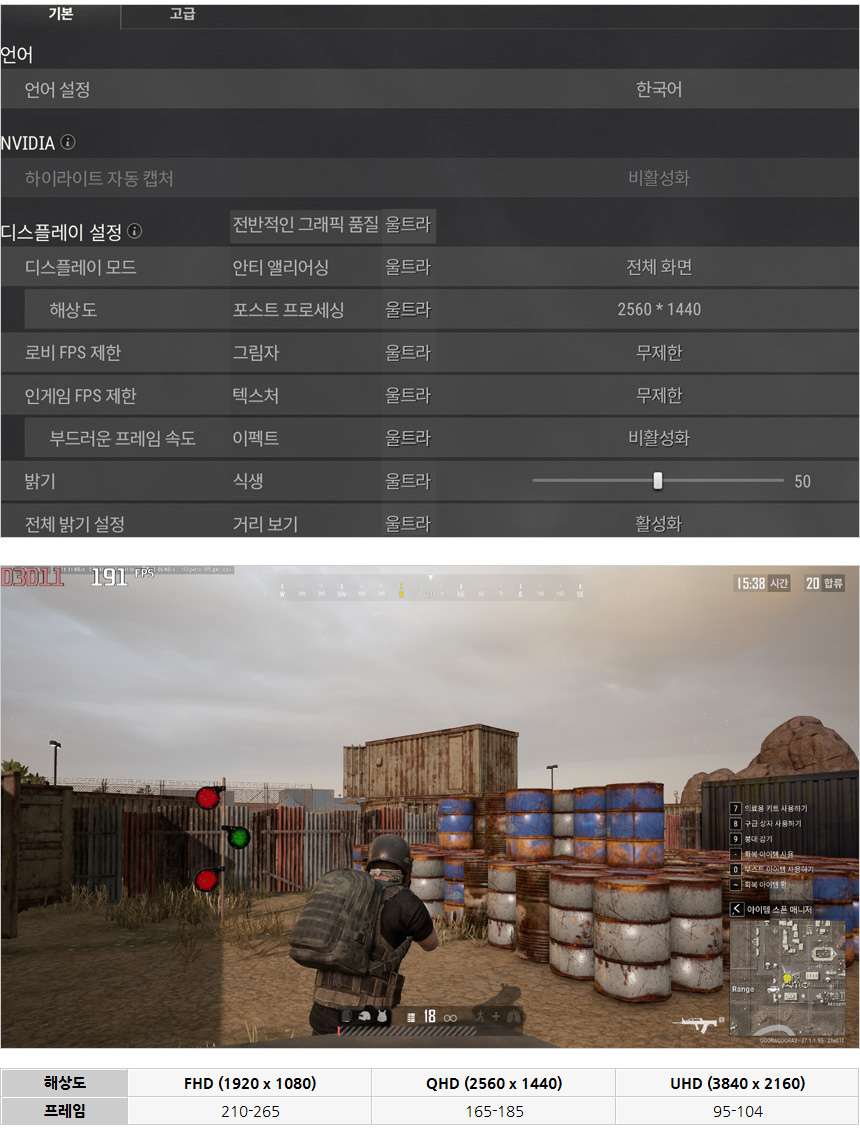 배틀그라운드를 울트라 옵션에서 플레이 하고 있는 모습으로 (연습모드) 4K 해상도에서도 100 프레임 이상을 보여주어 플레이가 가능하며 QHD 해상도 부터는 게이밍 모니터를 사용할 수 있는 성능을 보여주었다. (국민옵션등을 적용하면 QHD 에서도 180Hz 게이밍 모니터를 사용할 수 있다.)