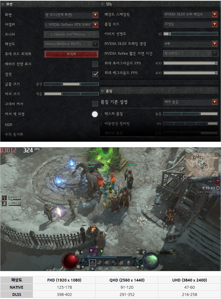 디아블로 4를 매우높음 옵션에서 플레이 하고 있는 모습으로 NATIVE 에서는 QHD 까지 원활한 플레이가 가능하다. DLSS를 활성화 하고 프레임 생성 옵션을 조정해 주면 4K 에서도 부드럽게 게임을 즐길 수 있다.