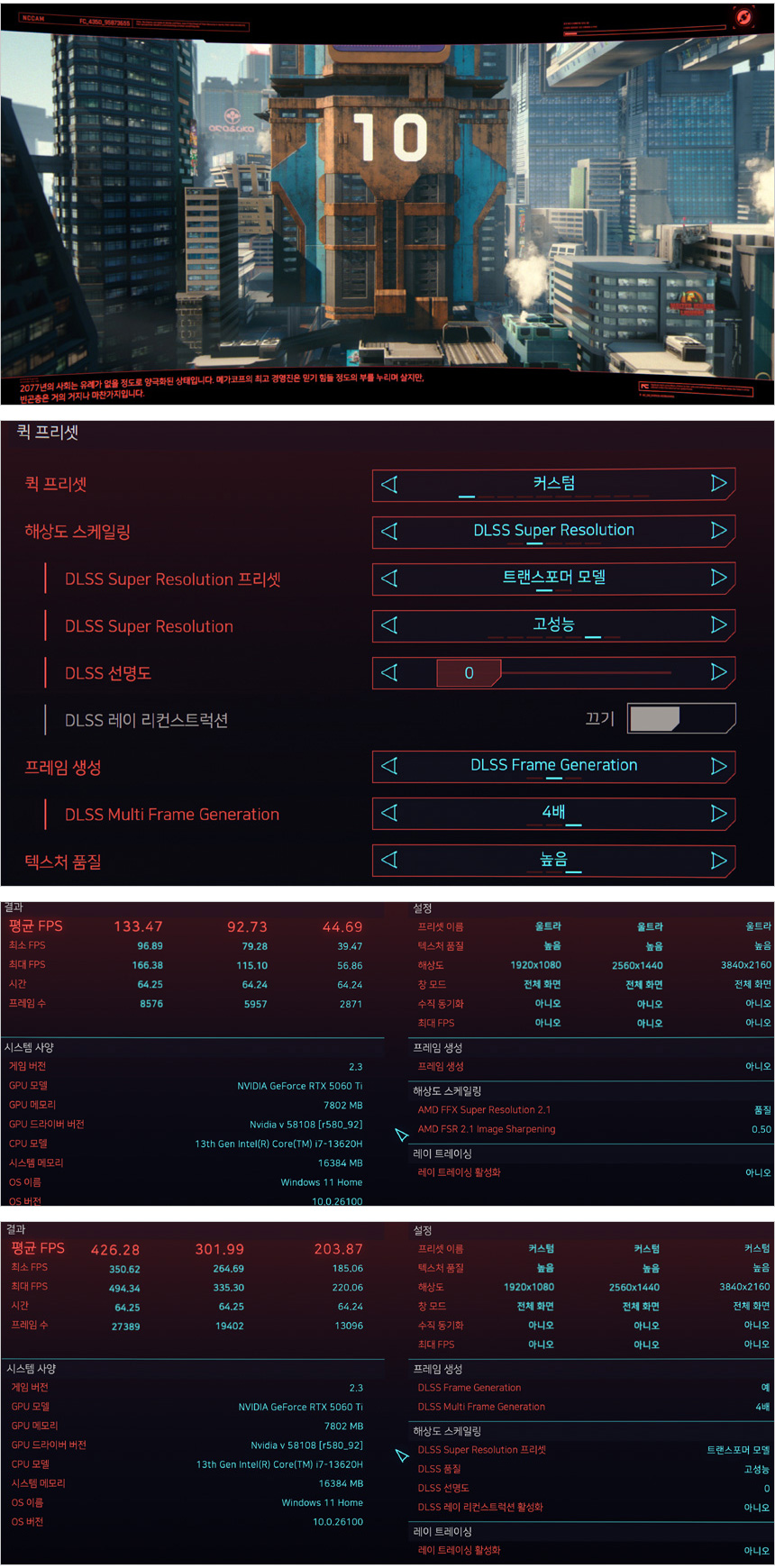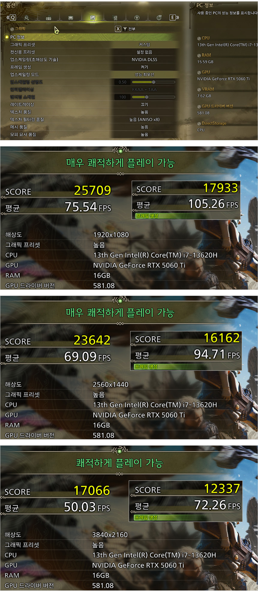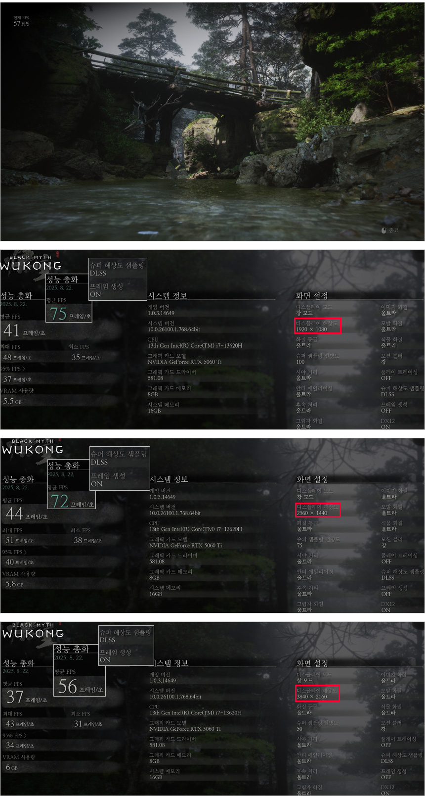 검은신화 오공 게임의 벤치마크를 실행한 모습으로 해상도별 프레임 변화가 크지 않은 것을 확인할 수 있다. DLSS를 적용하면 프레임이 유의미하게 상승하기 때문에 꼭 DLSS 프레임 생성을 활성화 해 게임을 즐기기 바란다. (QHD나 FHD 해상도를 권장한다.)