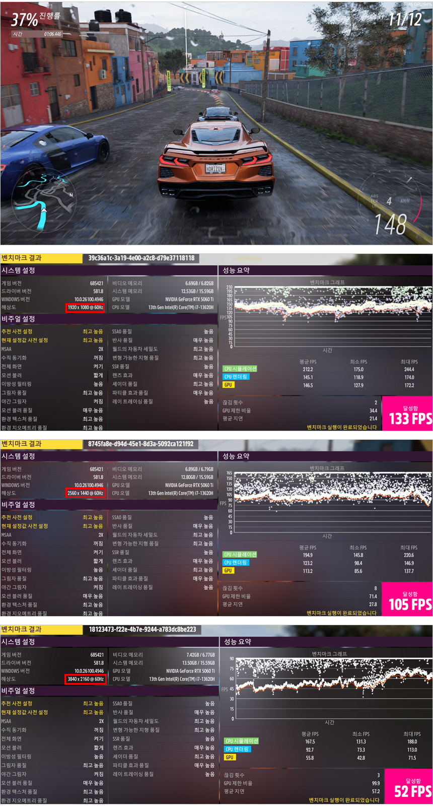 포르자 호라이즌 5 벤치마크를 최고 높음으로 실행한 모습으로 QHD에서 100 프레임 이상으로 플레이 되어 부드럽게 게임을 즐길 수 있다. (DLSS를 지원해 더 쾌적하게 게임을 플레이 할 수 있다.)