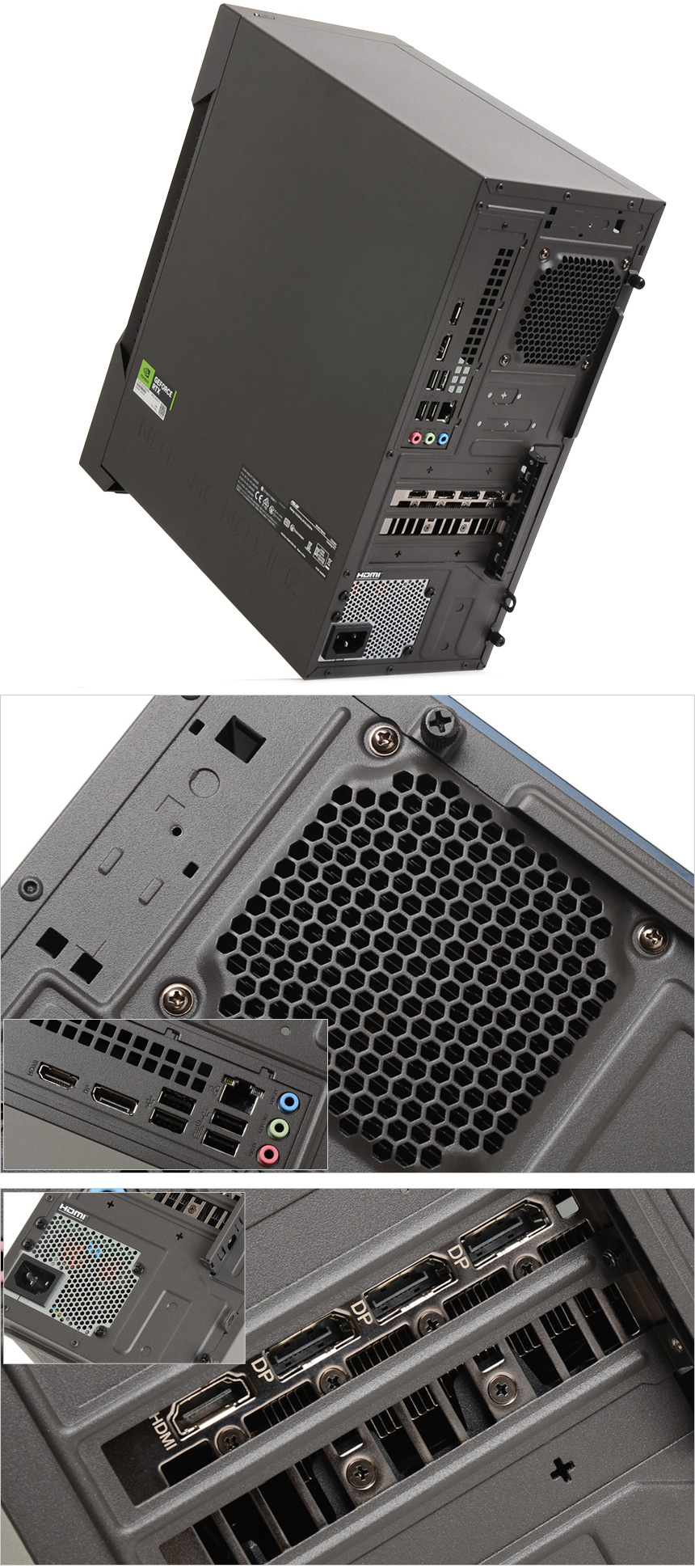 PC 후면부의 모습으로 상단에 통풍구가 설치되어 CPU와 각종 부품으로 뜨거워진 공기를 빠르게 배출해 주며 패널 분리를 위해 핸드스크류가 장착되어 있다. 또한 측면패널 오픈을 위한 손잡이를 제공하며 도난 방지를 위한 시큐리티 홀과 패널 분리를 방지하기 위한 홀이 설치되어 있다. (공공장소에 PC를 설치할 경우 부품 도난을 방지하기위해 자물쇠 등을 채워두어야 한다.)