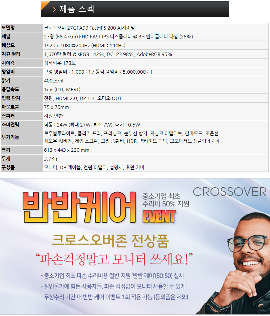 크로스오버 모니터는 5억원 생산물 배상 책임보험에 가입되어 있으며 중소기업 최초로 수리비 50%를 지원하는 반반케어 이벤트를 진행하고 있어 안심하고 사용할 수 있다. (무상수리 기간내 파손이 발생했을 때 수리비용의 절반을 지원한다.)