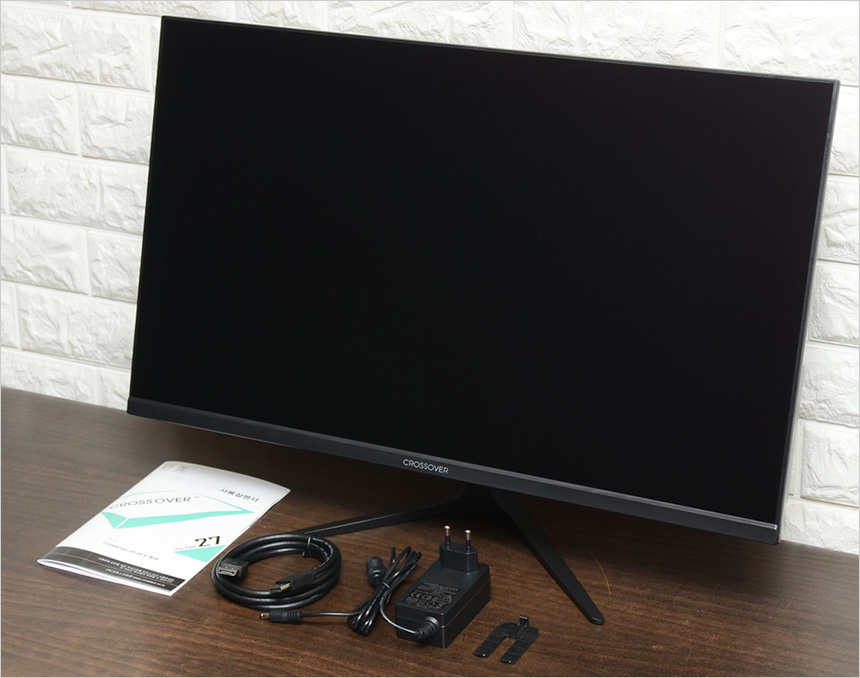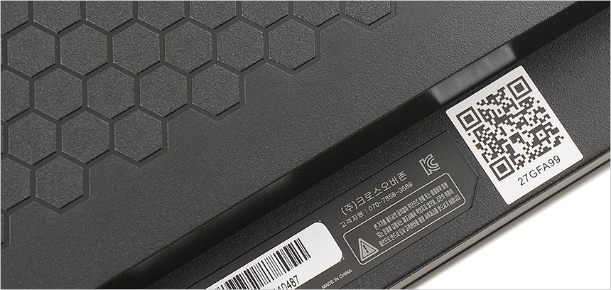전면 하단부의 모습으로 중앙에 크로스오버 레터링이 세겨져 있다. 이 제품은 눈건강을 생각한 모델로 청색광을 줄여 눈을 보호하는 블루라이트를 지원하는 것은 물론, 지속적인 깜빡임으로 인해 눈에 피로가 쌓이는 것을 방지하기 위해 플리커 프리 기술을 제공한다.
