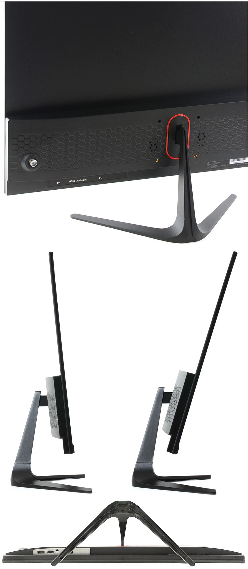 후면 중앙에 75mm 베사홀이 설치되어 벽에 걸거나 ARM 등에 장착해 사용할 수 있으며 (스탠드는 손쉽게 탈부착 할 수 있다.) 하단에는 DP 단자와 HDMI 단자, 전원 & 오디오 Out 단자가 설치된 것을 확인할 수 있다.