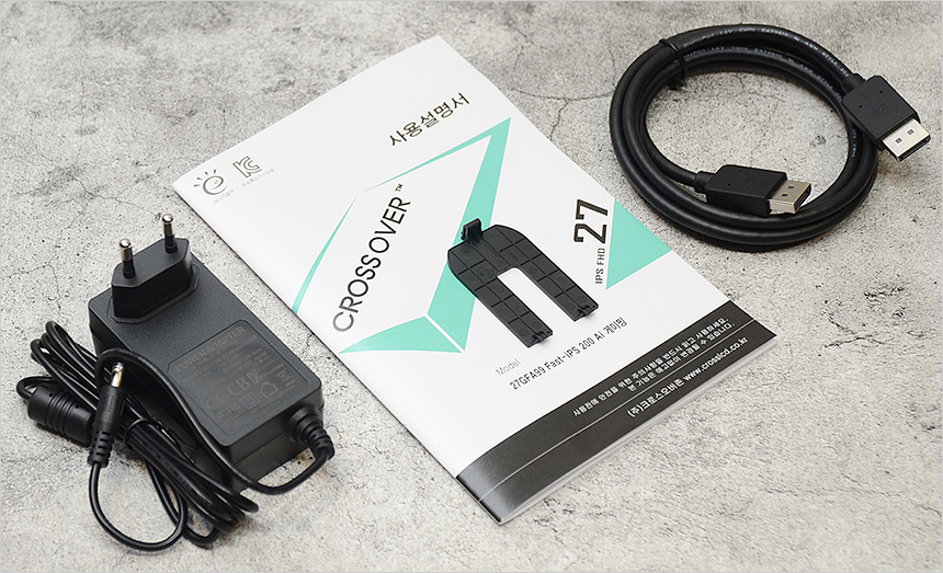 액세서리의 모습으로 사용 설명서를 비롯해 케이블 일체형 전원 어댑터와 DP 케이블, 후면커버가 제공되는 것을 확인할 수 있다.