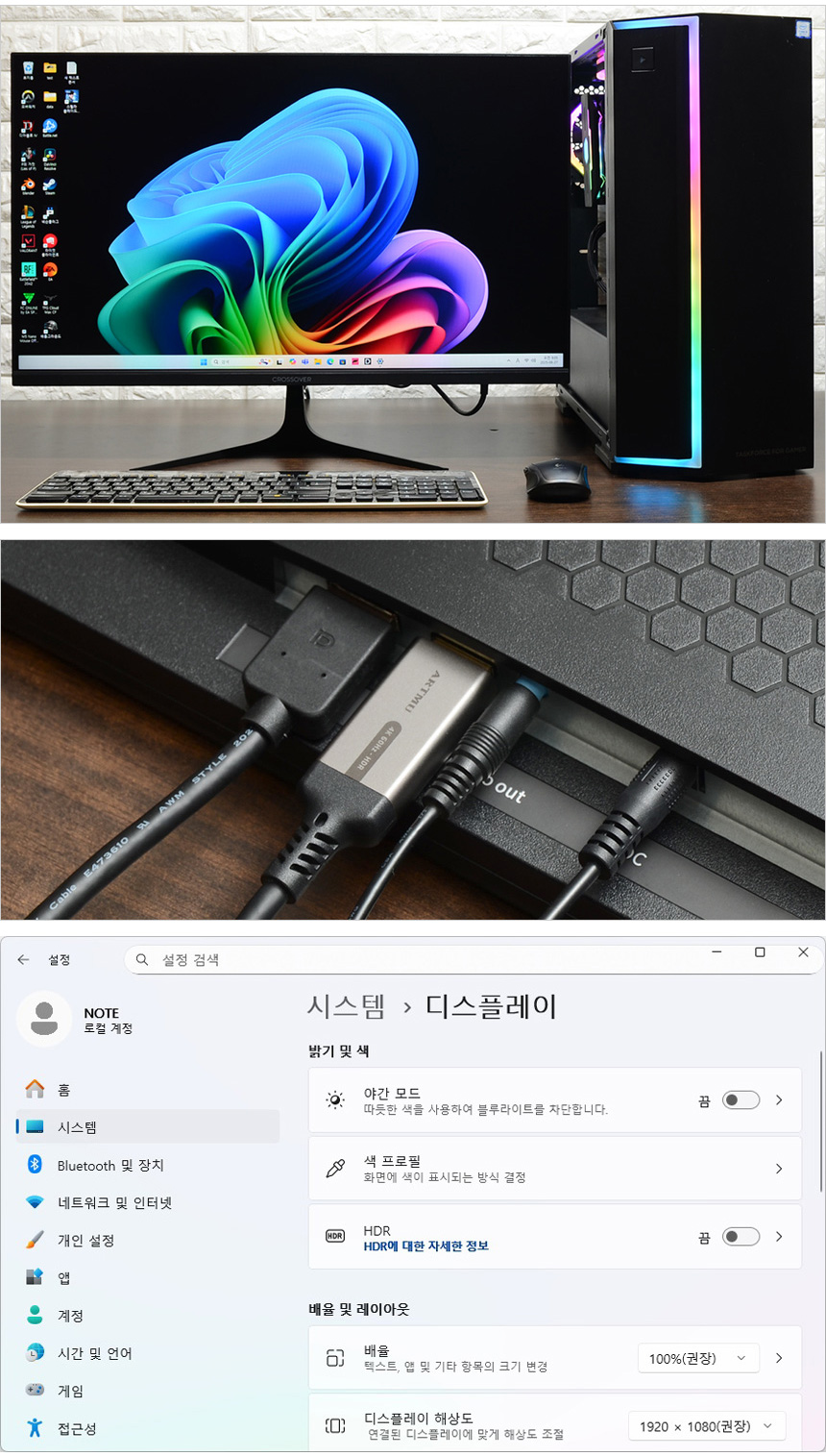 모니터를 책상에 설치한 모습으로 27형 슬림 모니터 답게 많은 공간을 차지하지 않았다. HDR 기술을 지원하는 모델답게 HDR 설정이 가능한 것을 확인할 수 있으며 DP와 HDMI를 지원해 다양한 디바이스를 연결할 수 있다. (HDMI 는 144Hz 까지 지원한다. PC와 연결해 게임을 즐긴다면 DP 단자를 활용하기 바란다.)
