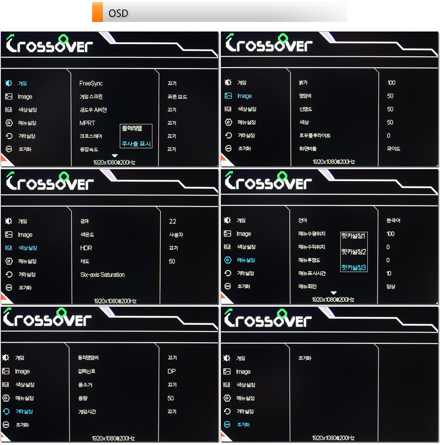 OSD의 모습으로 조그다이얼에서 핫키를 지원해 볼륨, 입력소스, 조준선 등을 빠르게 선택할 수 있으며 메인메뉴를 통해 밝기와 명암 설정을 비롯해 화면모드 및 동적 명암비 설정이 가능하다. 또한 화면비율 설정이 가능하며 색온도와 OSD 설정, 초기화, 로우블루라이드 설정과 블랙레벨, 프리싱크 설정을 지원한다. (어두운 화면을 세밀하게 표현하고 잔상을 줄여주는 새도우 Ai비전 기능이 제공된다.)