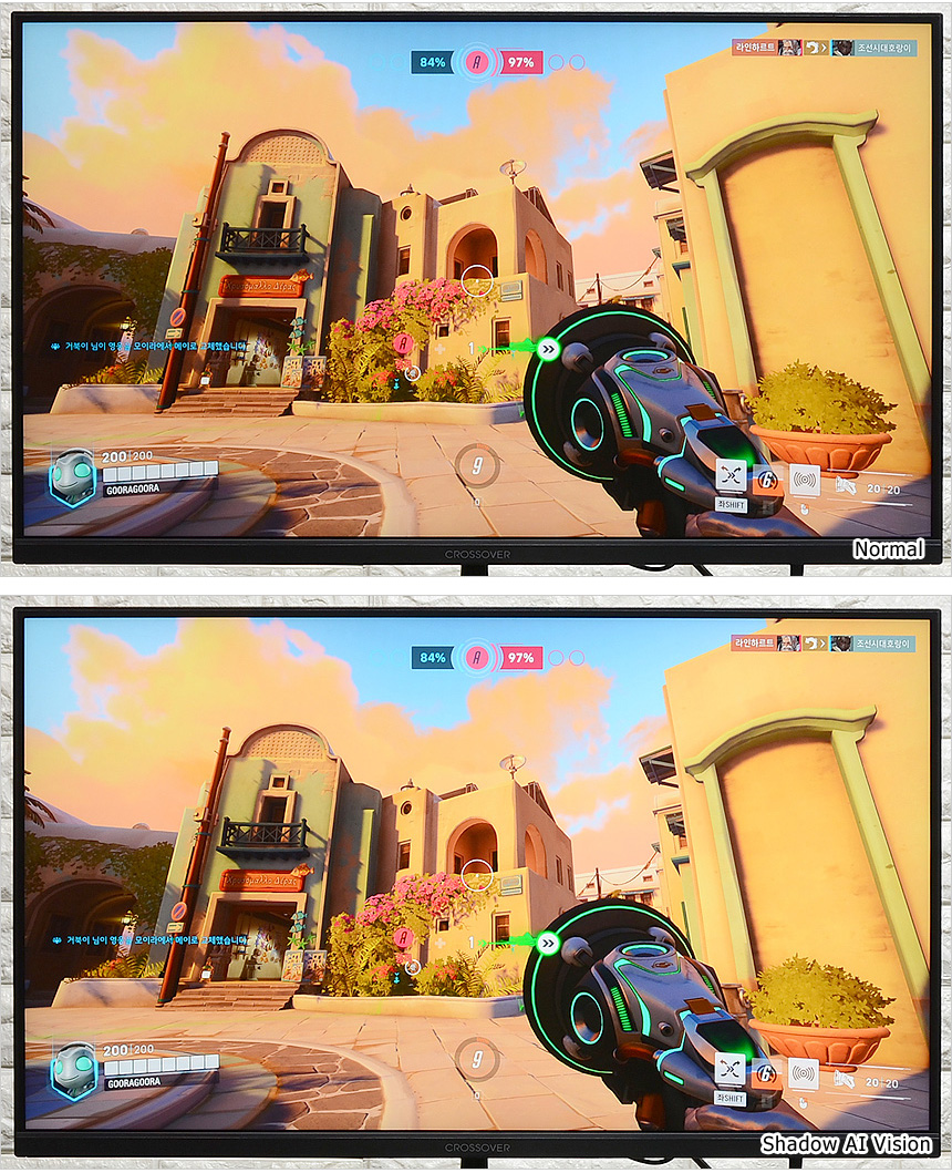 새도우 Ai 비전 기술이 적용되어 게임등에서 유용하게 활용할 수 있다. 밝기를 높여 암부 시인성을 개선하는 블랙레벨과 달리 이질적인 부분을 자연스럽게 조절하고 디테일을 개선해 영상 퀄리티를 높여주는 것을 확인할 수 있었다.