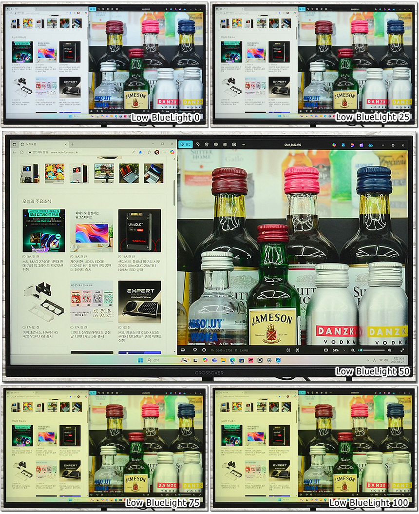 눈건강을 해치는 블루라이트 감소 기능을 제공한다. 상단의 사진은 단계별 영상의 모습으로 설정값에 따라 차이가 발생하는 것을 확인할 수 있다.
