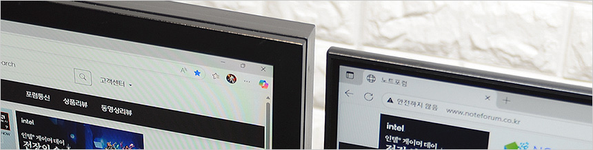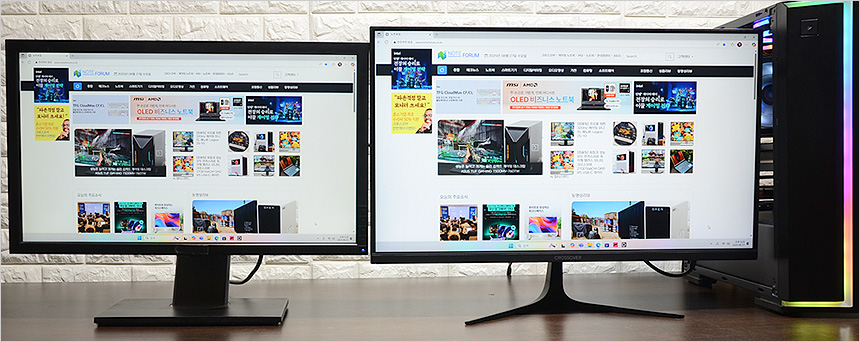 2대의 모니터를 설치한 김에 베젤 두께를 확인하고 있는 모습으로 확연한 차이를 보여주었다. 슬림 베젤이 적용된 모델로 높은 몰입감을 경험할 수 있을 것이다.