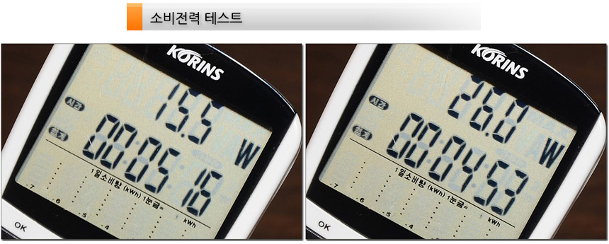 소비전력 테스트를 진행하고 있는 모습으로 대기모드에서는 0.5W, 50% 밝기에서 15.5W, 100% 밝기에서 26W의 전력으로 작동하는 것을 확인할 수 있었다. (전기세 걱정없이 사용할 수 있을 것이다.)