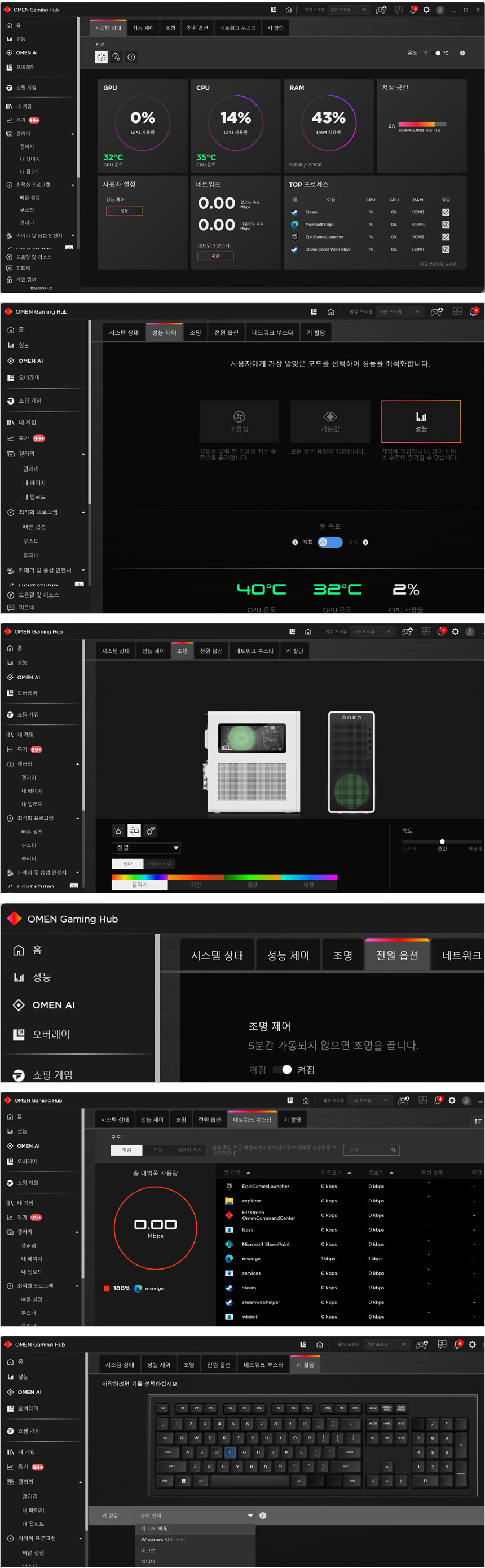 게이밍 PC의 사용성을 한층 높여주는 오맨 게이밍허브를 지원한다. CPU와 GPU 사용율 등을 모니터링 할 수 있으며 성능을 높일 수 있는 메뉴가 별도로 구성되어 있어 용도에 맞게 PC를 셋팅할 수 있다. 또한 라이브러리 메뉴가 제공되어 설치한 게임들을 편하게 실행할 수 있으며 갤러리 메뉴가 별도로 제공되어 배경화면을 손쉽게 교체할 수 있다.