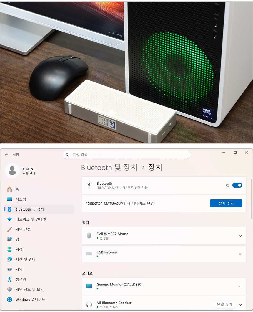 테스트를 위해 책상에 PC를 셋팅한 모습으로 예상했던 대로 많은 공간을 차지하지 않았다. (참고로 테스트용 모니터의 크기는 27형 이다.) 책상 밑에 설치해야 하는 일반 데스크탑 PC와 달리 특유의 작은 크기로 부담없이 책상에 설치해 사용할 수 있을 것이다.