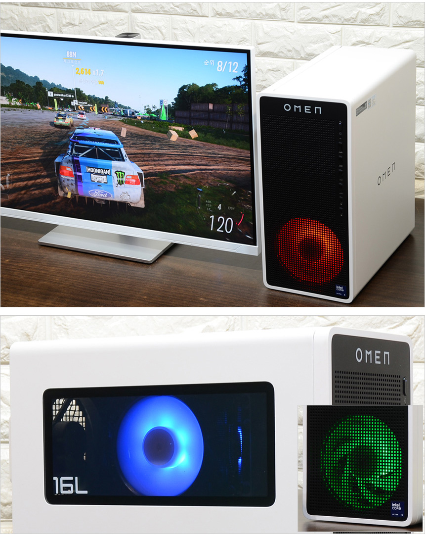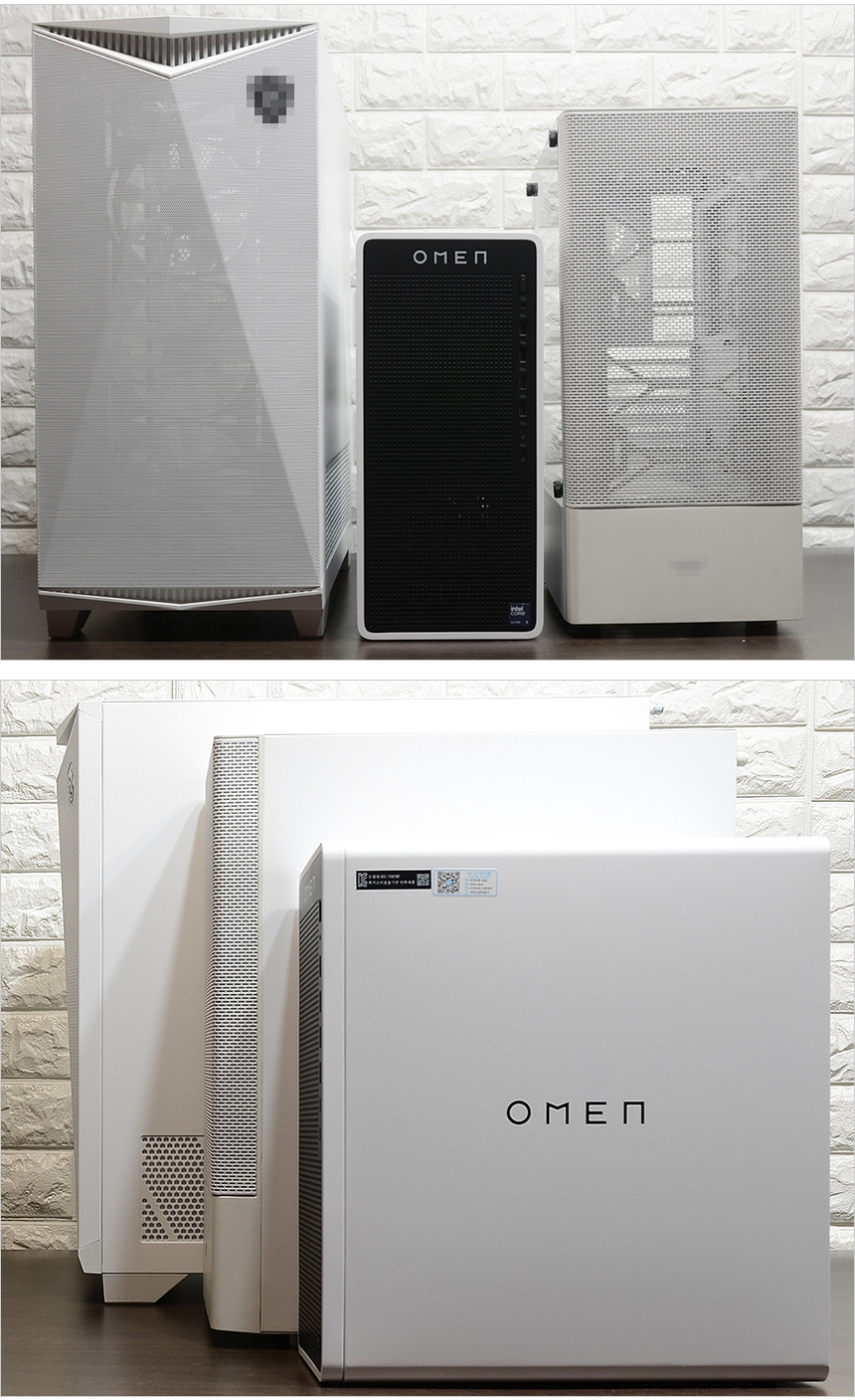 PC 전면부의 모습으로 상단에 OMEN 레터링이 세겨져 있으며 원활한 공기 유입으로 안정성을 높이기 위해 전면 전체에 통풍구가 설치된 것을 확인할 수 있으며 주변기기를 연결할 수 있도록 전면에 단자가 설치된 것도 눈에 띈다. 상단에는 전원 버튼과 상태표시 LED, 헤드셋이나 이어폰 연결을 위한 오디오 (COMBO) 단자가 설치되어 있고 하단에는 4개의 A타입 USB 단자와 (USB 3.2 Gen1 & Gen2 각각 2개) C타입 단자 (USB 3.2 Gen1 & Gen2 각각 1개)를 지원해 빠른 데이터 전송이 가능하며 많은 주변기기를 연결해 사용할 수 있다.