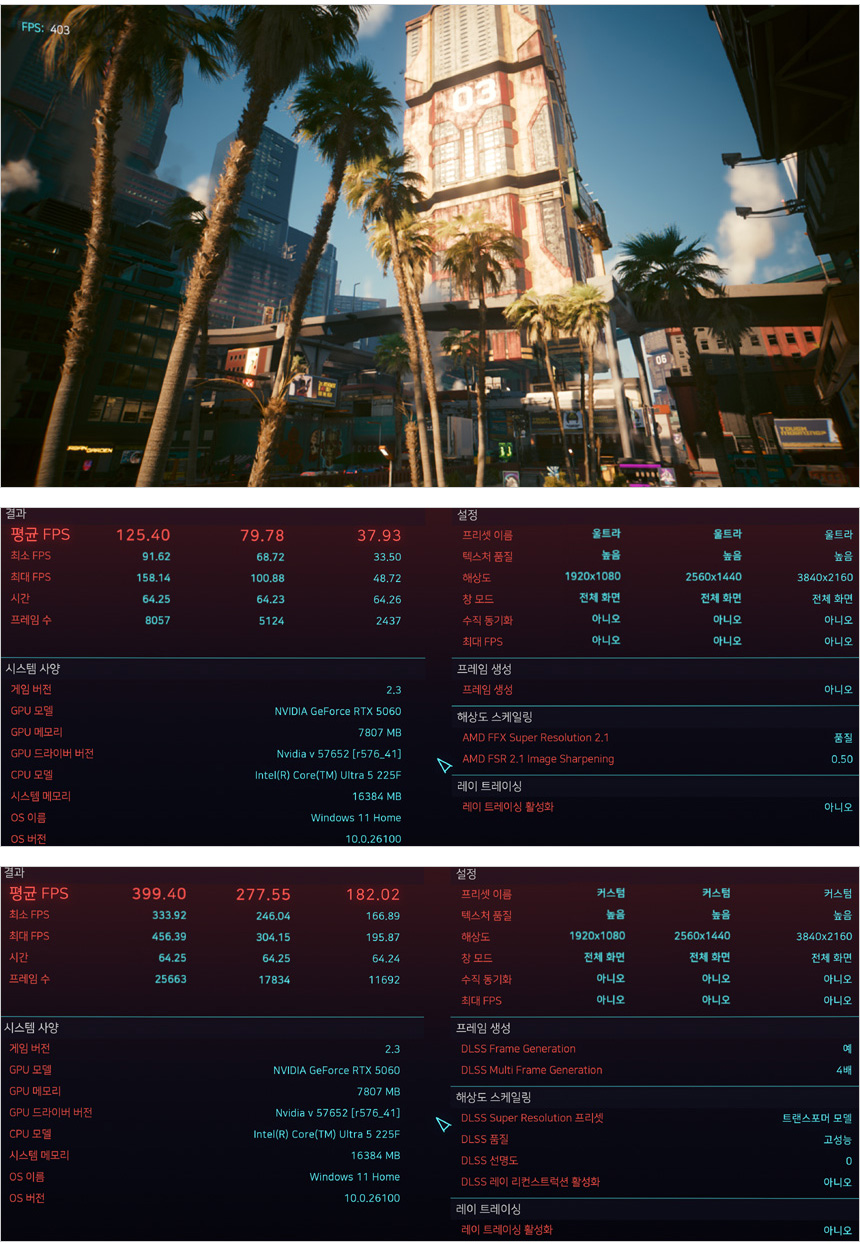 검은신화 오공 게임의 벤치마크를 실행한 모습으로 해상도별 프레임 변화가 크지 않은 것을 확인할 수 있다. DLSS를 적용하면 프레임이 유의미하게 상승하기 때문에 꼭 DLSS 프레임 생성을 활성화 해 게임을 즐기기 바란다.