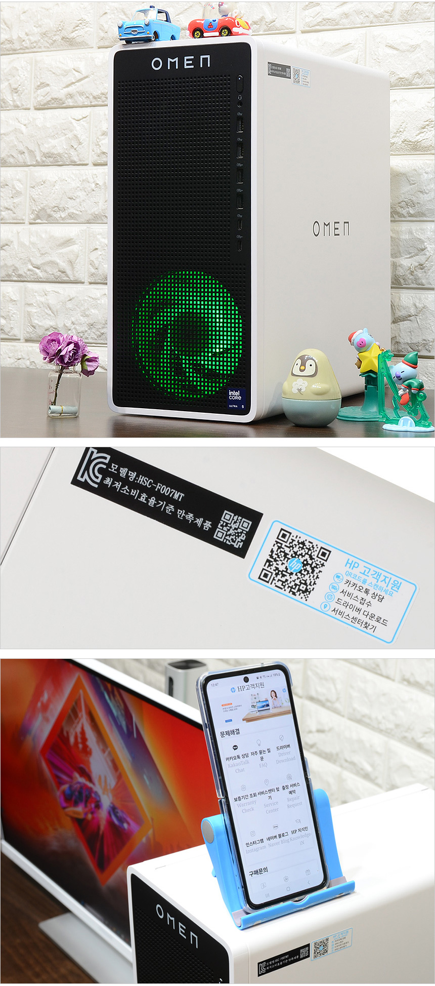 PC 우측면의 모습으로 상단에 QR코드가 부착된 것을 확인할 수 있다. QR코드를 스마트폰으로 스캔하면 고객지원 페이지로 연결되어 PC에 문제가 발생했을 때 손쉽게 상담 받을 수 있으며 (유저들에게 익숙한 카카오톡 상담을 지원한다.) 윈도우 재설치시 드라이버를 다운로드 할 수 있다.