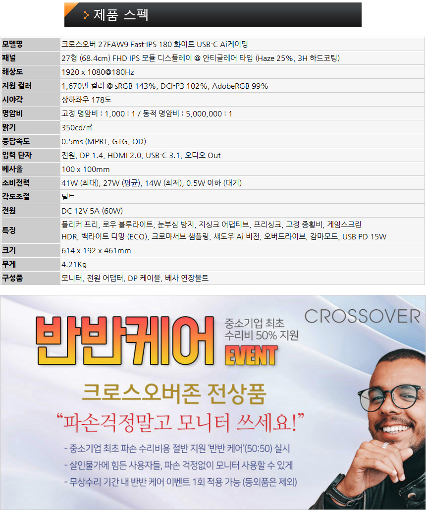 크로스오버 전상품은 5억원 생산물 배상 책임보험에 가입되어 있으며 중소기업 최초로 수리비 50%를 지원하는 반반케어 이벤트를 진행하고 있어 안심하고 사용할 수 있다. (무상수리 기간내 파손이 발생했을 때 수리비용의 절반을 지원한다.)