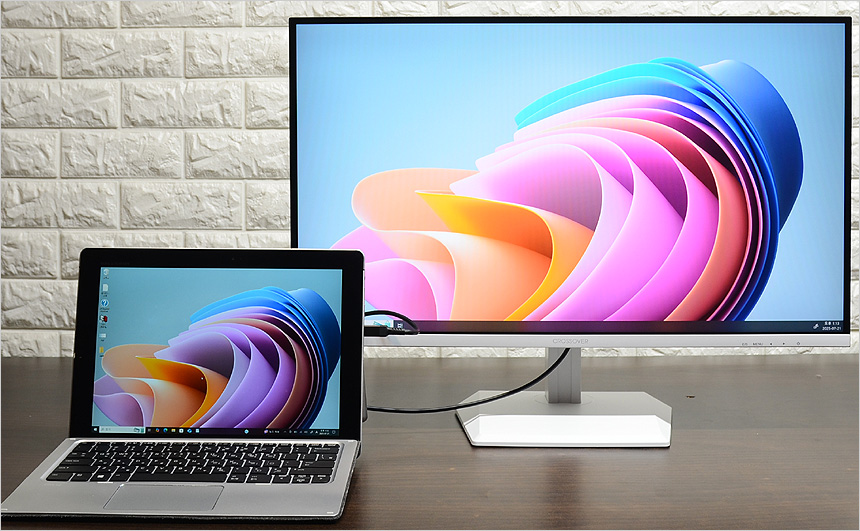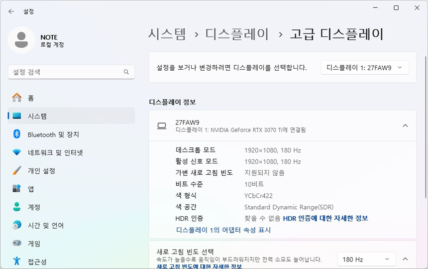 테스트를 위해 모니터를 설치한 모습으로 슬림 베젤이 적용된 27형 모델답게 많은 공간을 차지하지 않았다. 책상의 공간이 협소 하더라도 불편없이 설치해 사용할 수 있을 것이다. 또한 HDR을 기본 지원하는 모델답게 디스플레이 설정에서 HDR 적용이 가능하며 C타입 단자를 지원해 다양한 디바이스와 연결할 수 있다.