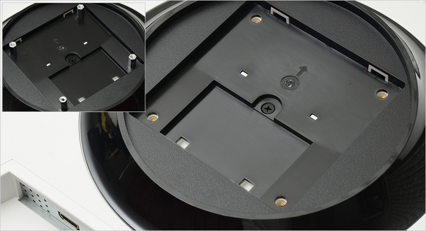 스탠드의 모습으로 하단 중앙에 케이블 정리를 위한 가이드가 설치된 것을 확인할 수 있으며 바닥면에는 고무패드가 부착되어 미끄러짐을 미연에 방지한다. 또한 틸트를 지원해 사용자에 맞게 모니터 각도를 조정할 수 있다.