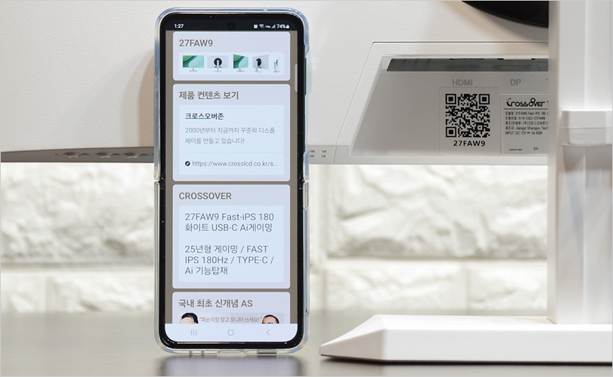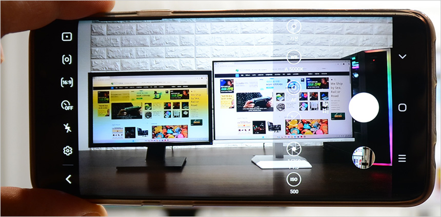 플리커 프리 테스트를 위해 구형 모니터와 비교한 모습으로 눈으로 보면 구분이 힘들지만 스마트폰 카메라 기능을 이용하면 모니터의 플리커 현상을 확인할 수 있다. (프로 모드에서 셔터스피드 1/300 이상으로 셋팅) 테스트용 모니터는 플리커 현상이 발생하는데 반해 크로스오버 27FAW9 Fast-IPS 180 화이트 USB-C Ai게이밍은 깜빡임이 발생하지 않았다. (동영상을 통해 자세히 확인하기 바란다.)