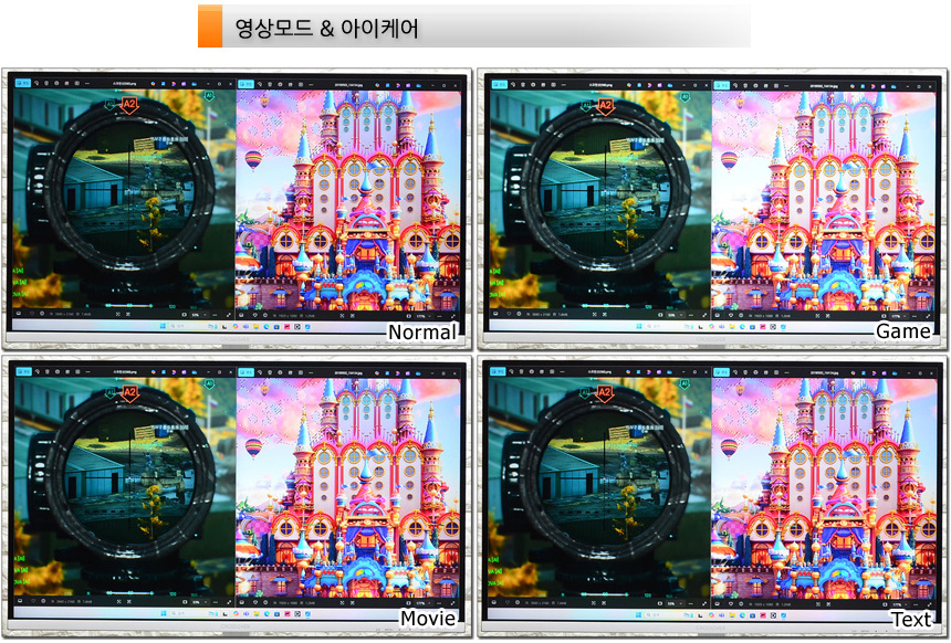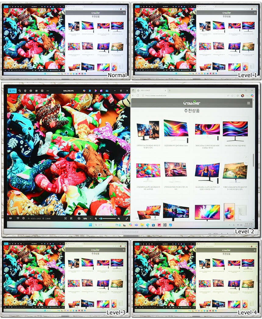 눈건강을 위해 다양한 기술을 지원한다. 상단의 사진은 눈건강을 해치는 블루라이트의 감소 기능을 테스트 하고 있는 모습으로 설정값에 따라 차이가 발생하는 것을 확인할 수 있다. (기존 모니터와 달리 색의 왜곡이 크지 않은점이 인상적이다.)