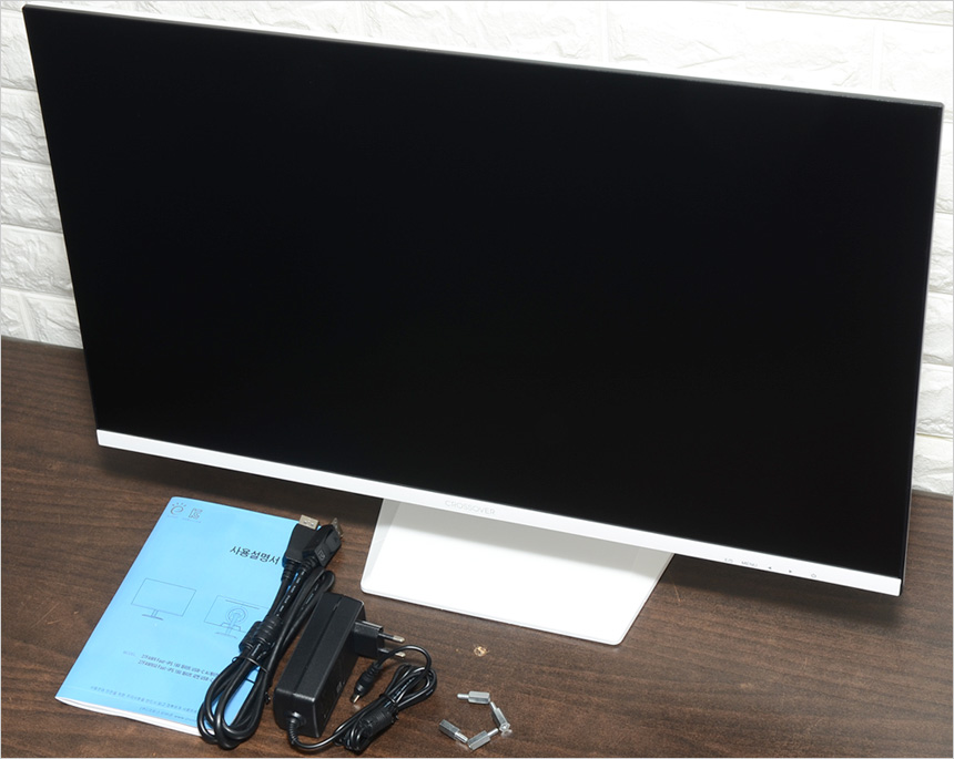 풀KIT 의 모습으로 모니터를 비롯해 케이블 일체형 전원 어댑터와 DP 케이블, 사용설명서, 베사 연장볼트가 제공되는 것을 확인할 수 있다.